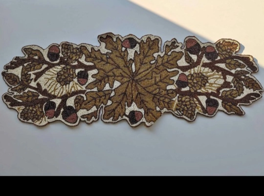 Add a touch of autumn charm to your dining table with this lovely beaded table runner! The design features oak leaves, acorns, and pine cones in earthy brown tones. It's perfect for fall gatherings or everyday use to bring a cozy vibe to your home