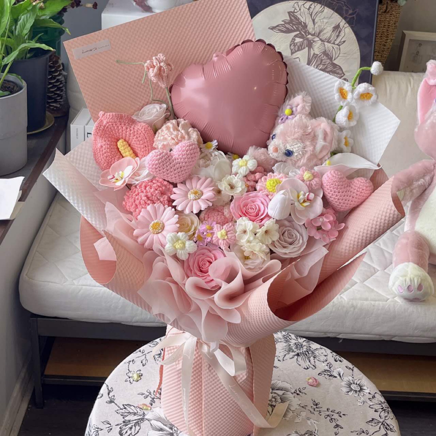 A beautiful pink flower bouquet featuring roses, daisies, and other delicate blooms. There's also a cute stuffed animal nestled among the flowers, making it a perfect gift for someone special! Combining the timeless elegance of soap flowers with the intricate charm of crochet flowers