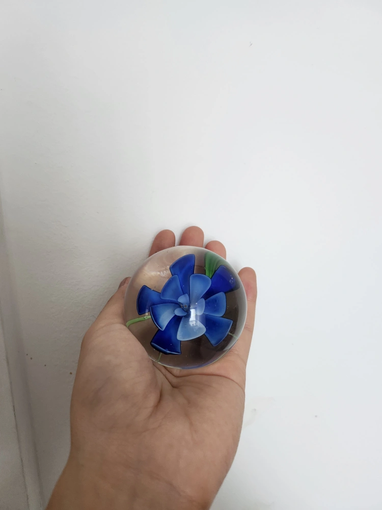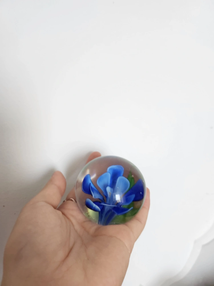 230Here's a lovely glass paperweight featuring a blue flower design. It's perfect for adding a touch of colour to your desk or shelf pickup near bayview station