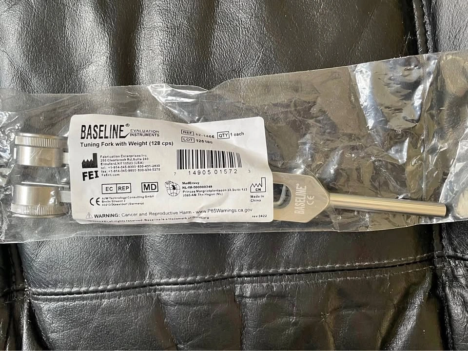Tuning fork with weight, 128 cps. Never opened (changed programs in school) but has poked through packaging.