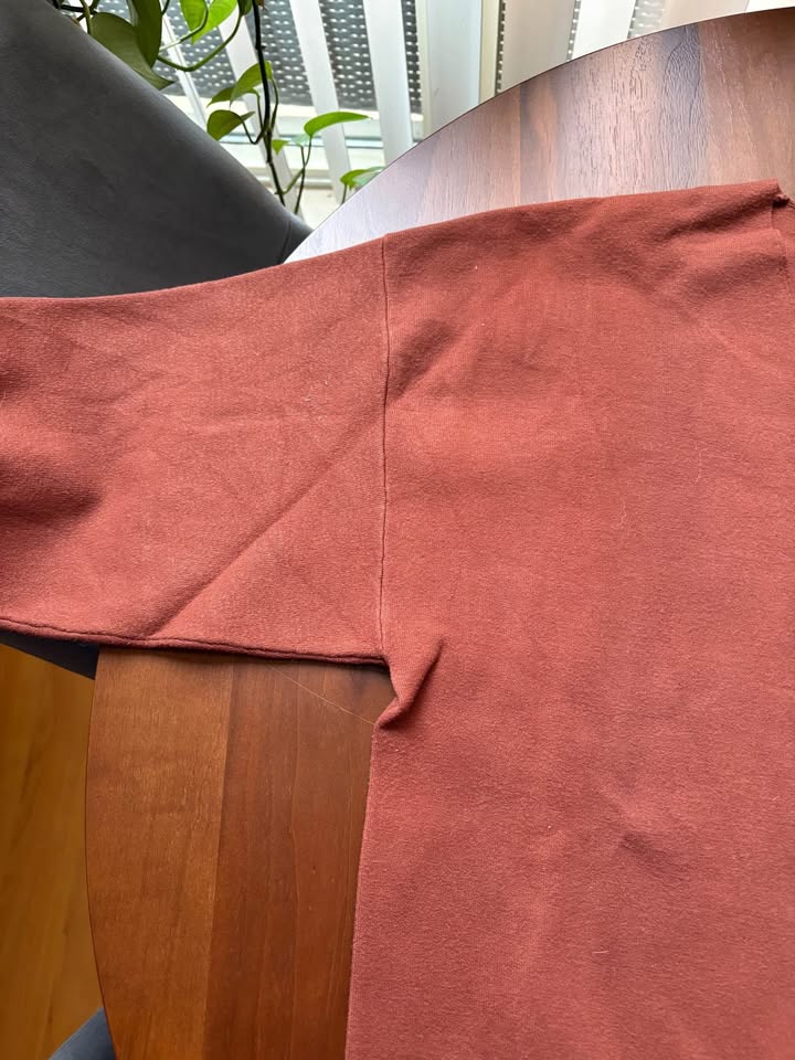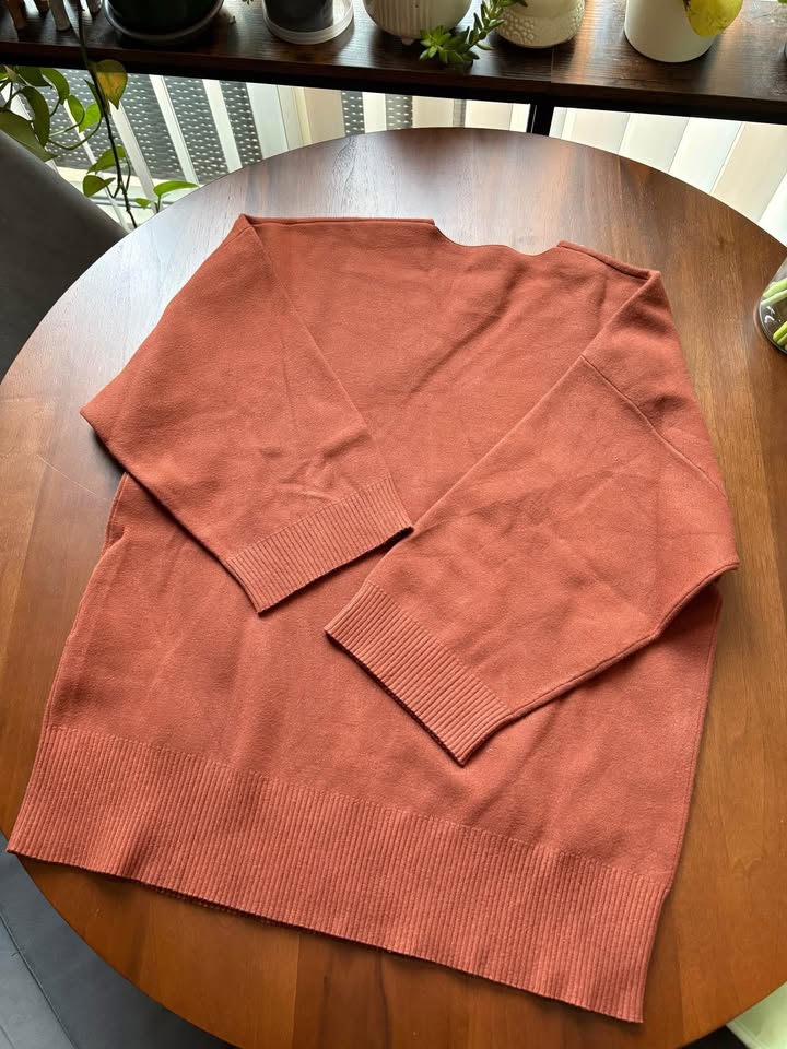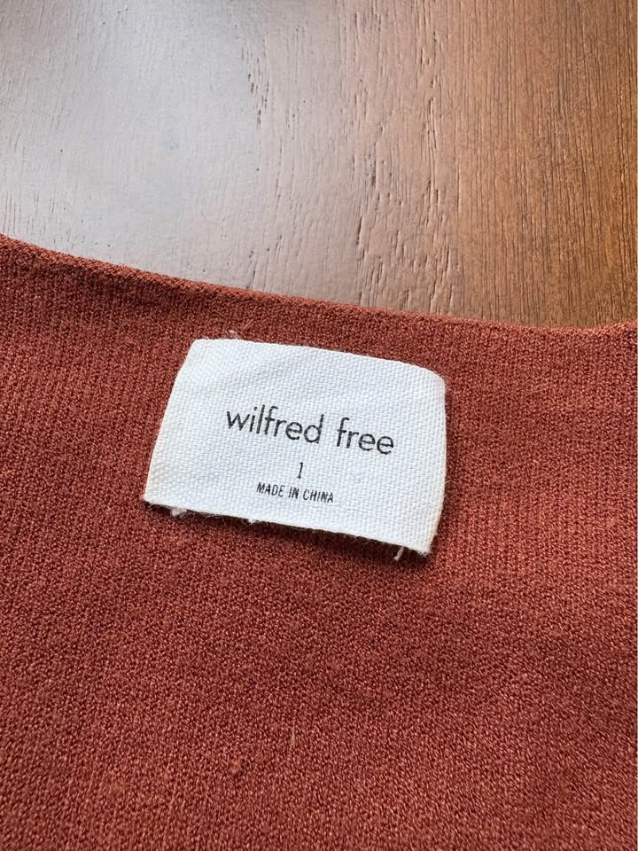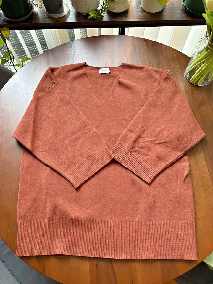 Wilfred 3/4 sweater in burnt orange, size 1 - I’m usually a M and it’s a comfortable, roomy fit. Dropped shoulders, and it’s a beautiful thick weight knit. Sleeves are a wide cut, so very comfy. Flattering V neck in the front. Great condition, no rips/tears/stains.