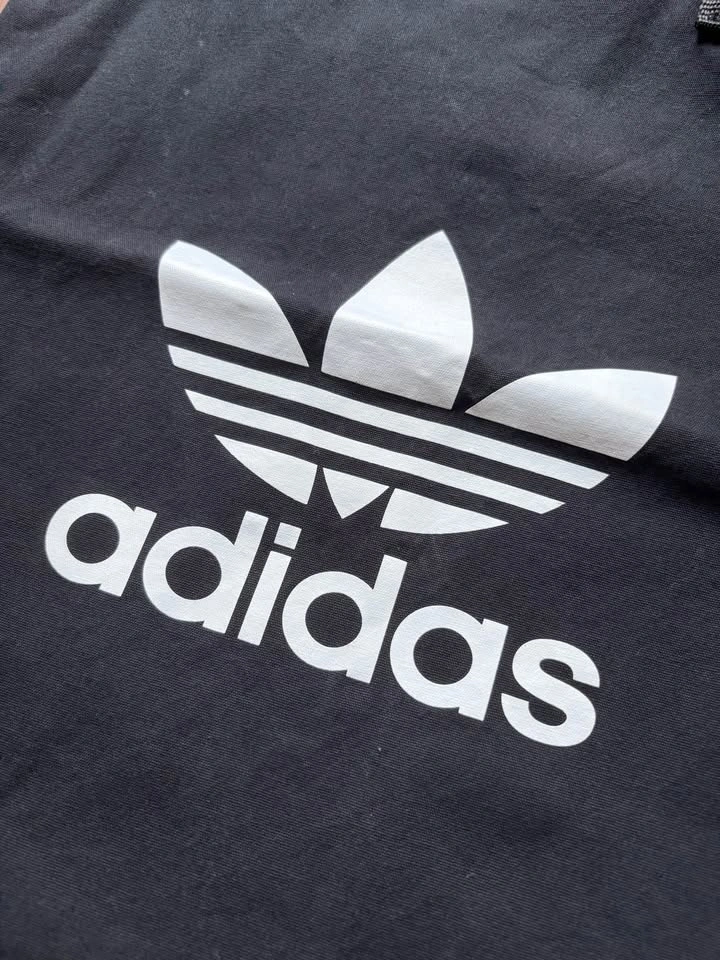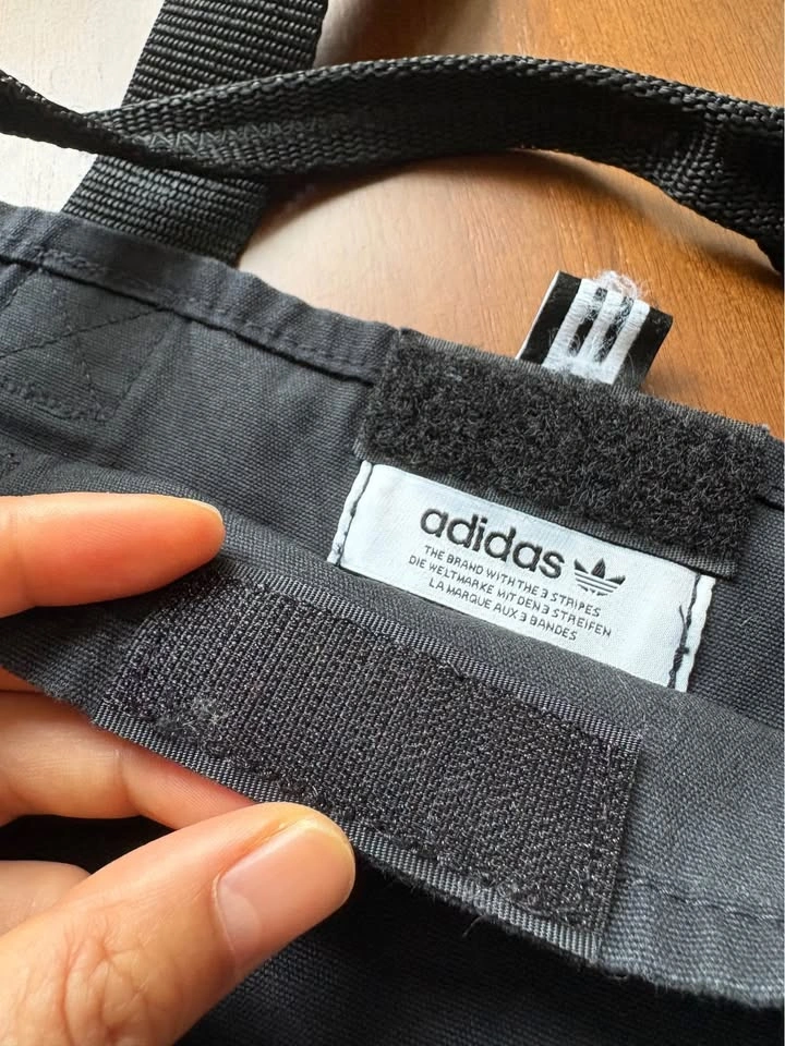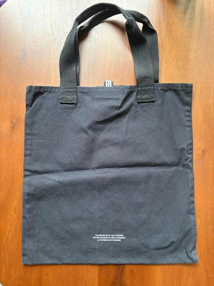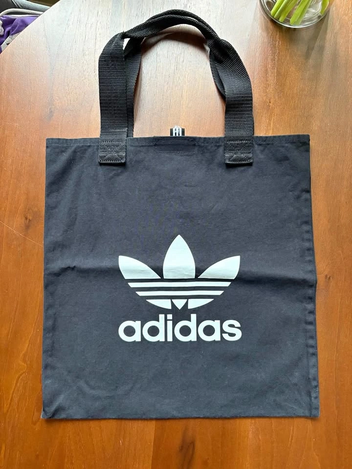 Adidas black fabric bag - handles are shorter, so it’s more of a handheld bag than a tote. Has Velcro closure at the top, and is made of a thick cotton material. Measures approx 15x14.5 inches. Great for carrying your essentials along with water bottle, small umbrella, etc. The crease in the middle is from storage, just needs a steam/iron.