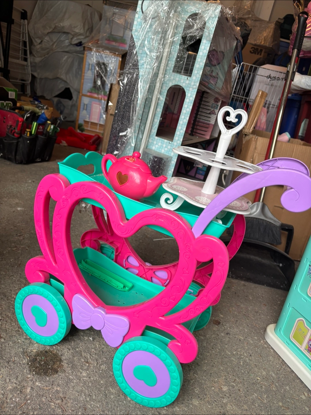 This cute toy tea cart is perfect for little ones who love to play pretend! It comes in a fun pink and turquoise colour scheme. It's in great condition and ready for a new home!