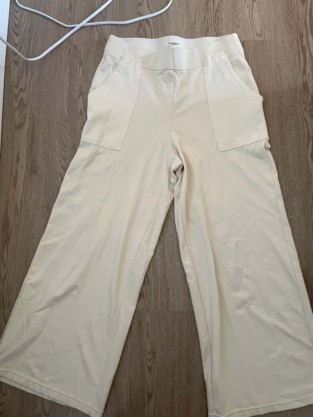 These are Max Studio wide leg pants in a beige color. They have a comfortable elastic waistband and stylish front pockets. Perfect for a relaxed yet fashionable look!