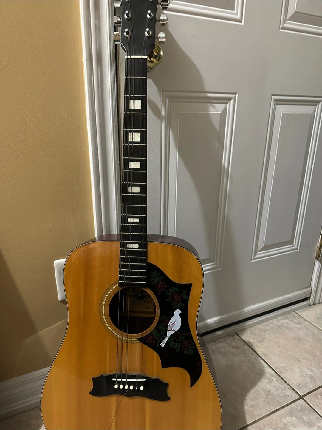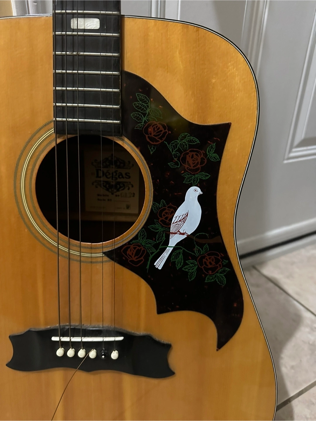 Selling a Dégas acoustic guitar. It has a unique design with a dove and roses on the pickguard. Great for beginners or anyone looking for a classic acoustic sound. 1 cord needs to be fixed, other than that great condition.