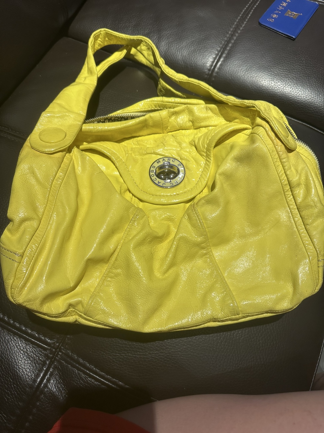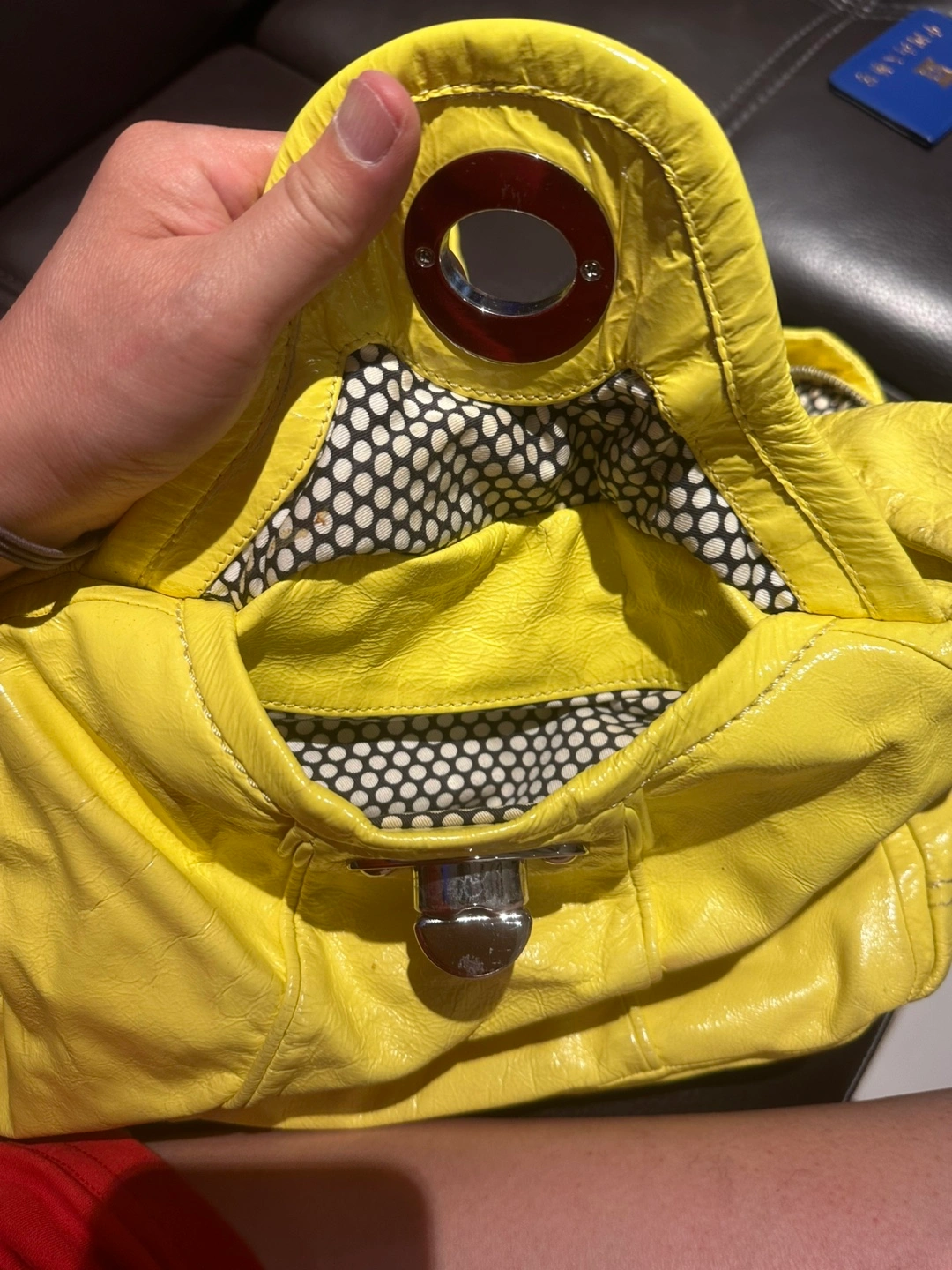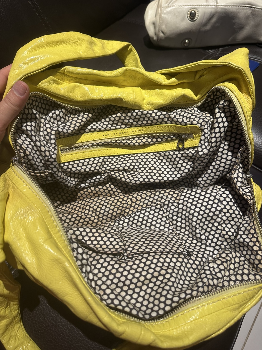 Selling a vibrant yellow leather shoulder bag from Marc by Marc Jacobs! It features a unique black and white polka dot lining. The bag has some signs of wear, but is still in good condition for everyday use. Perfect for adding a pop of color to your outfit! Clean up my closet.