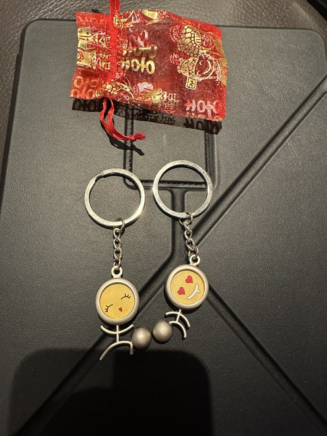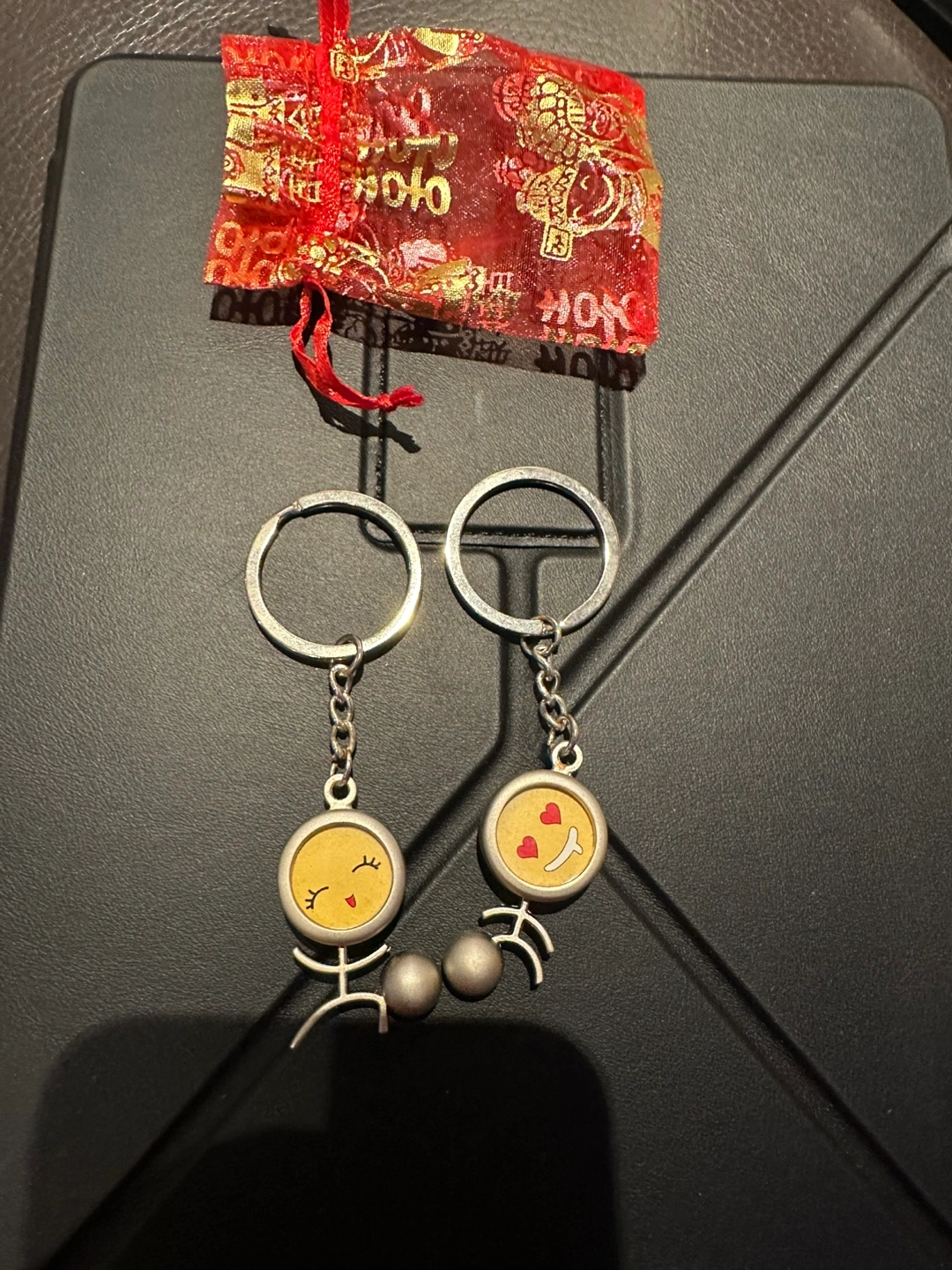 Selling a pair of adorable matching keychains! They feature cute stick figure designs with different expressions. Comes with a small red decorative bag. Need to clean up my closet.
