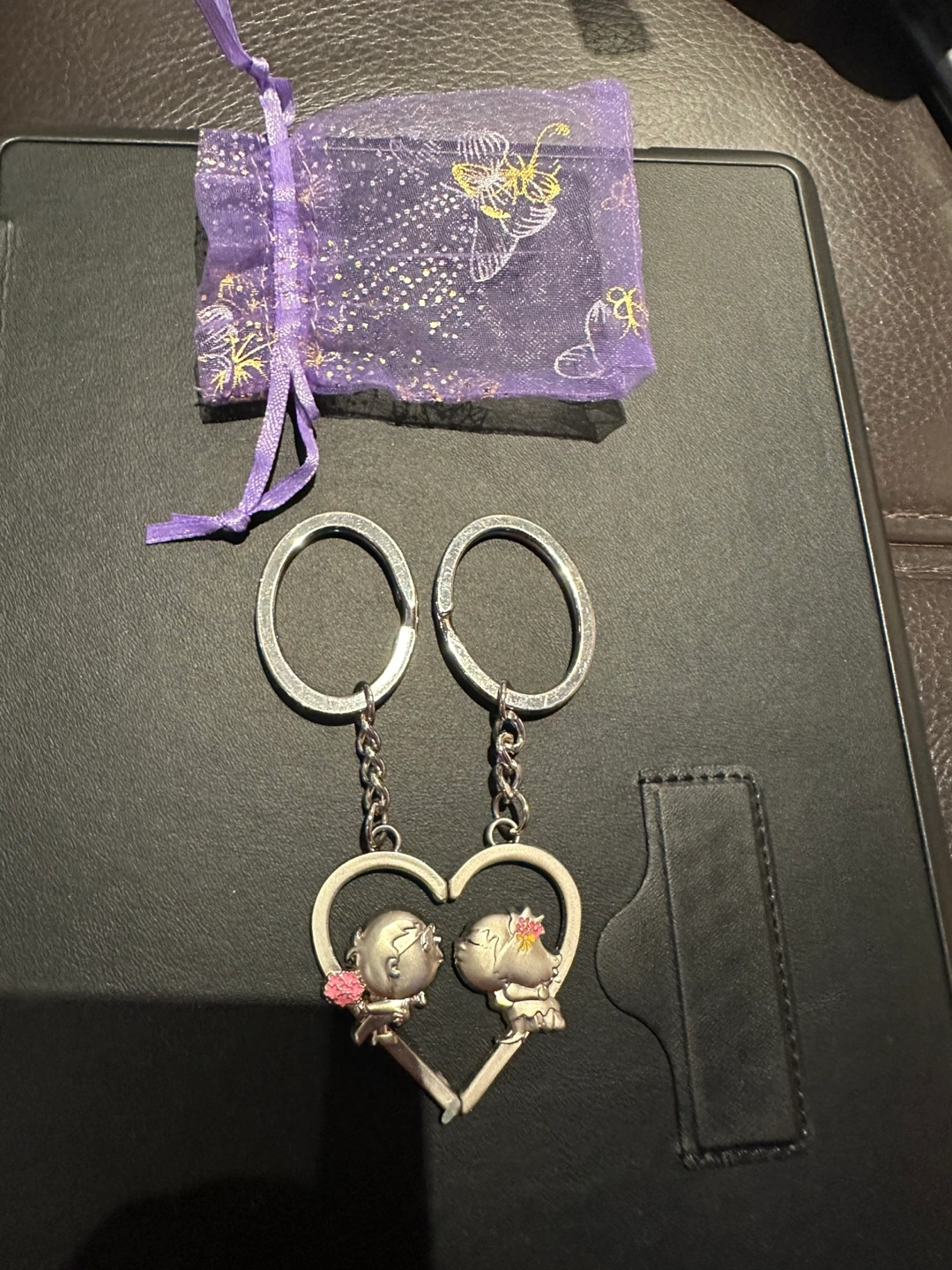 This is a cute keychain with a couple kissing in a heart shape. It comes with a purple gift bag. Need to clean up my closet.