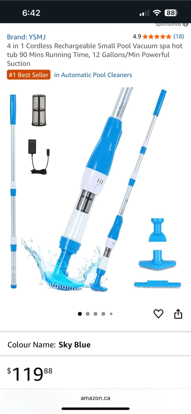 142Selling a YSMJ 4-in-1 cordless rechargeable small pool vacuum, perfect for your spa or hot tub! It runs for 90 minutes and has a powerful suction of 12 gallons per minute. It's brand new and comes with: - Main body - Telescopic pole - Handle - Triangular brush - Long brush - Wide-end nozzle - Charger - Instructions Originally bought for $119.88