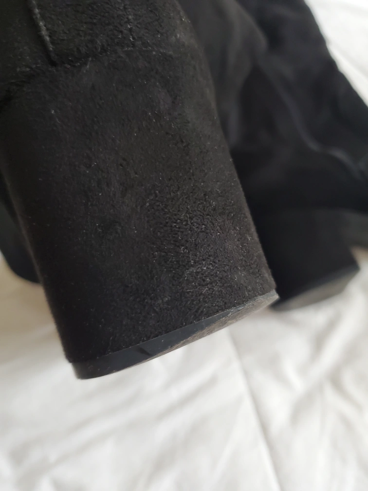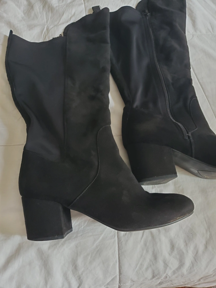 Here are some black faux suede knee-high boots in a size 11w. They have a block heel and a zipper closure. They are in good condition with small sign of wear on the soles. See pic..