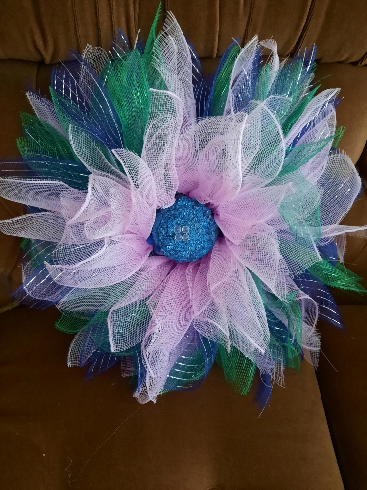 Handmade Mesh Flower Wreath - Purple, Blue, Green