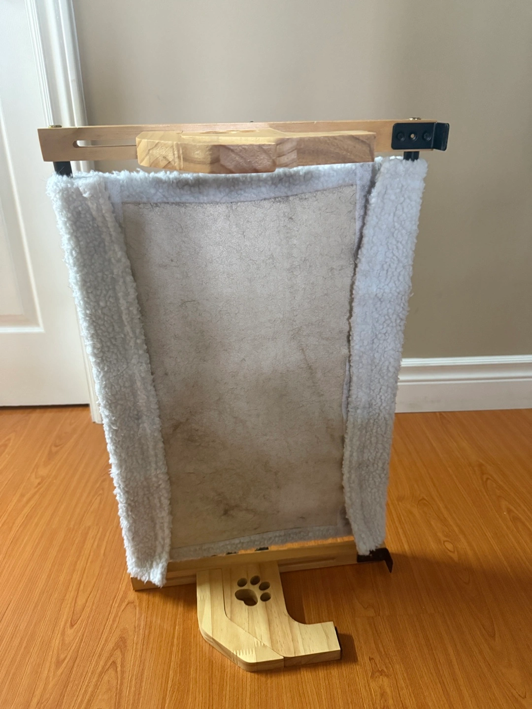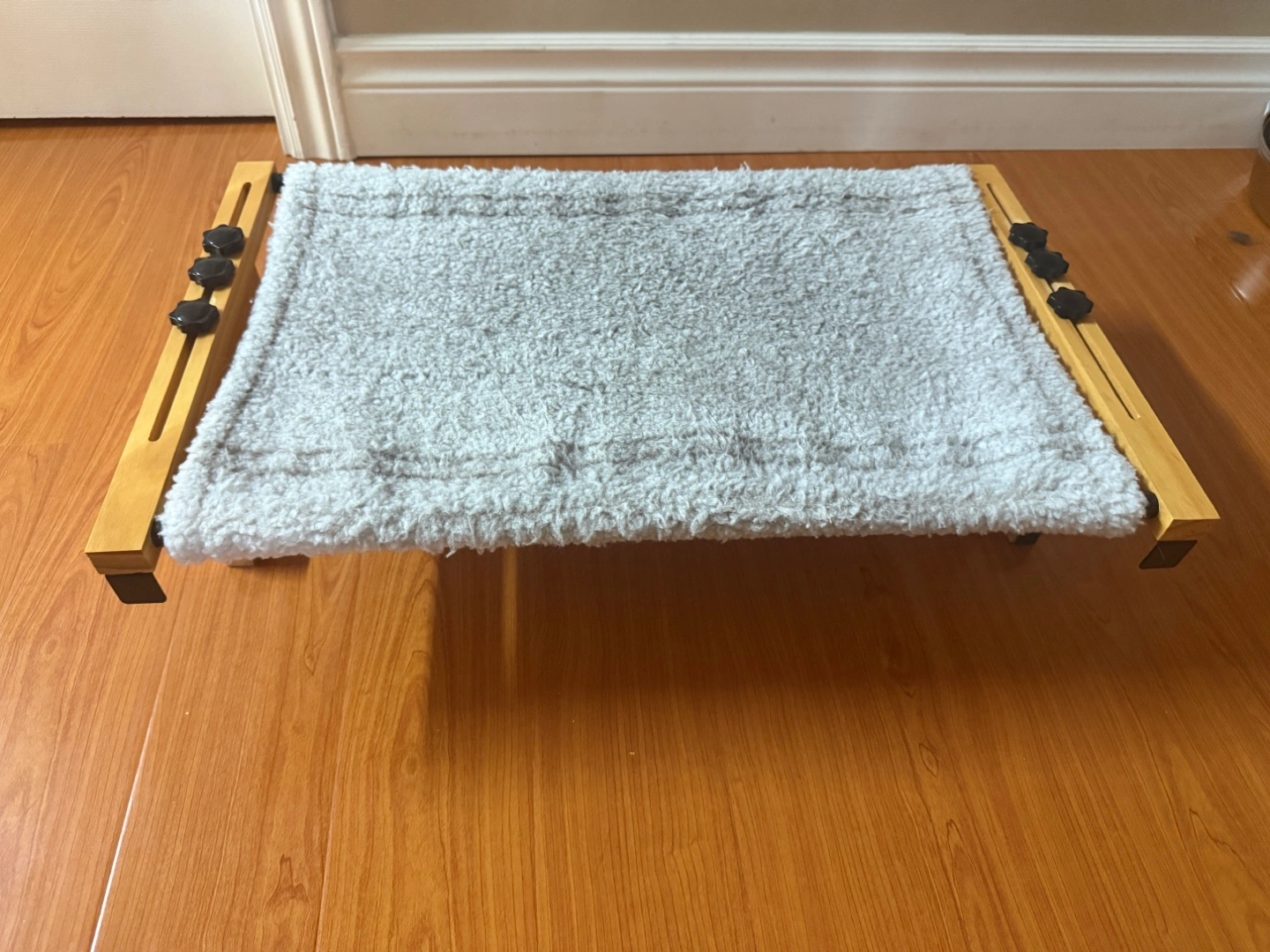 Looking to sell this adjustable cat bed. It has a wooden frame and a soft, fluffy mat for your kitty to relax on. The frame is adjustable, so you can find the perfect height for your furry friend. It's in good condition and ready for a new home!