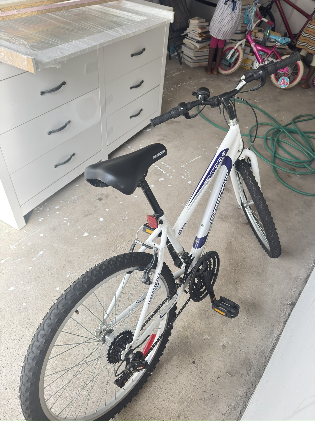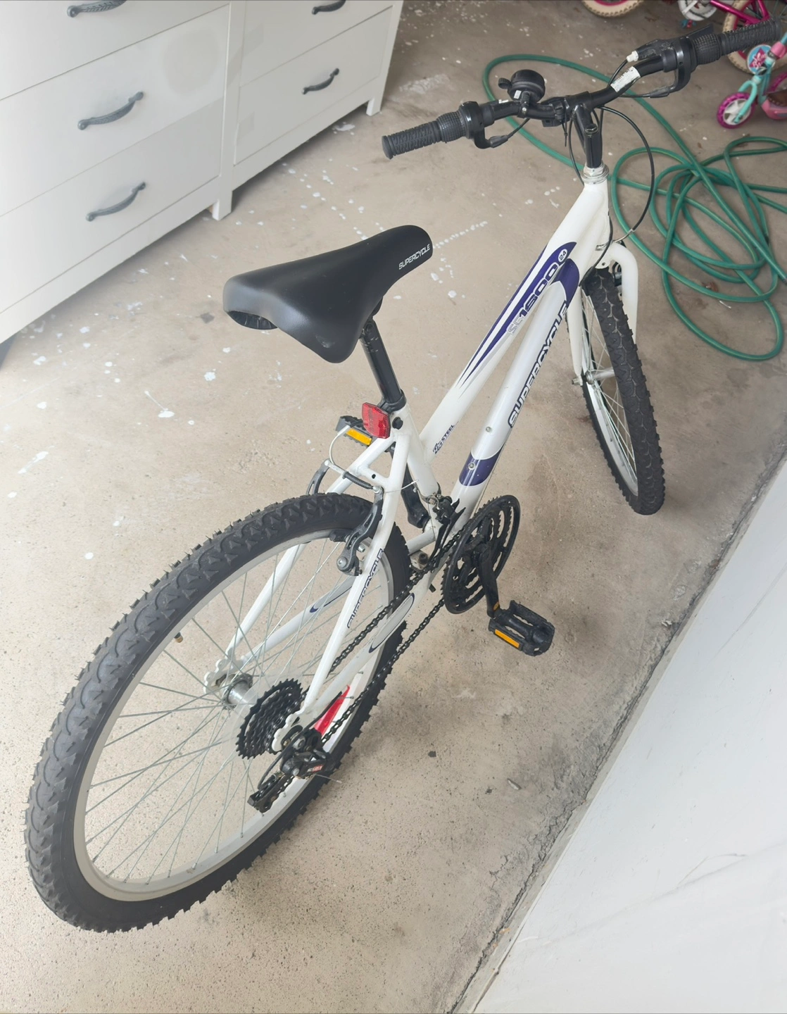 Selling a Supercycle Mystique mountain bike. It's in great shape and ready for some trails or city cruising! The white frame with purple accents gives it a stylish look. Perfect for someone looking for a reliable and fun ride