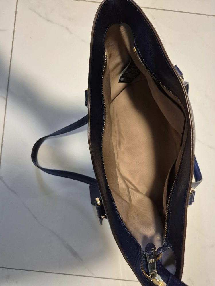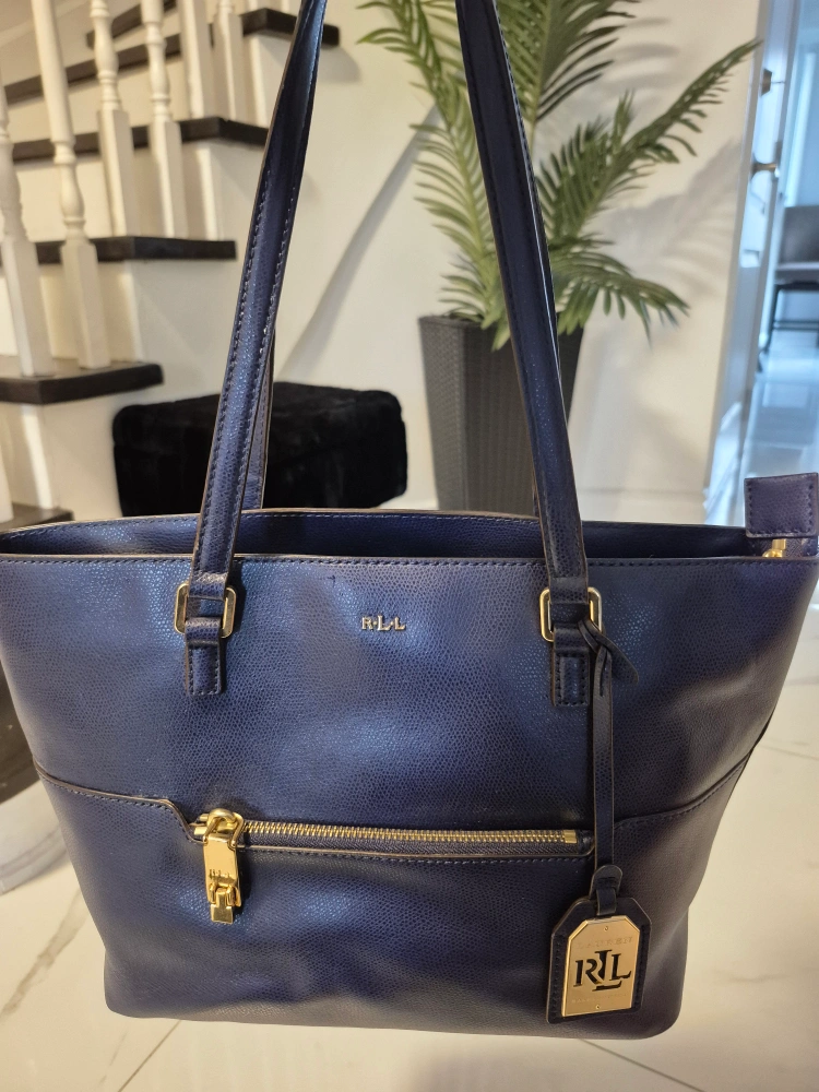 Selling a Ralph Lauren tote bag in navy blue. It's in good condition and perfect for everyday use. The bag features the classic RL logo and has a spacious interior. It's a stylish and practical accessory!