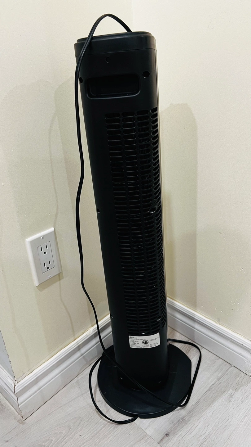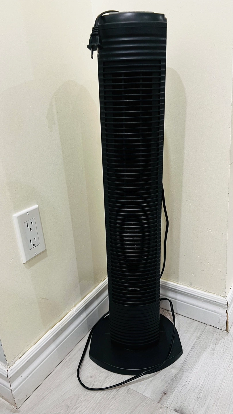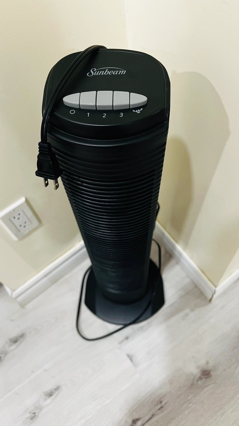 Selling a Sunbeam tower fan in black. It has a slim design that fits easily into any room. The fan features multiple speed settings to keep you cool and comfortable. It's in great condition and ready to use