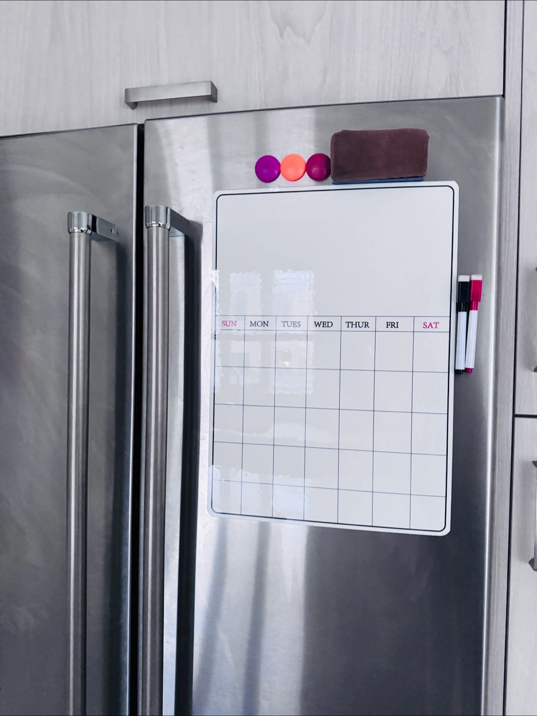 Keep your schedule organized with this magnetic fridge calendar! It's sized at 30cm x 42cm and easily attaches to your refrigerator.