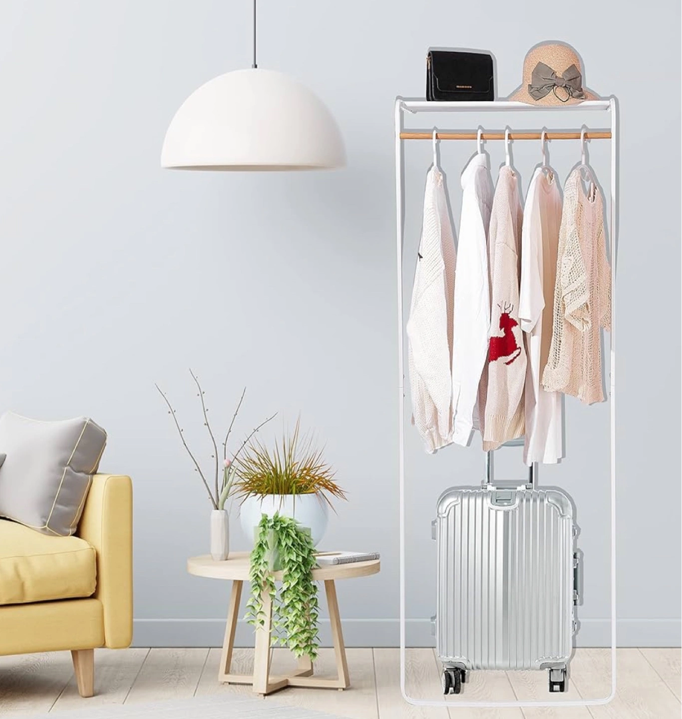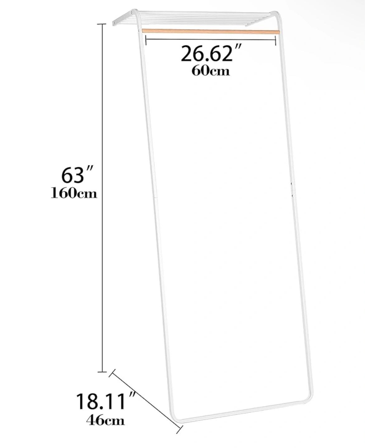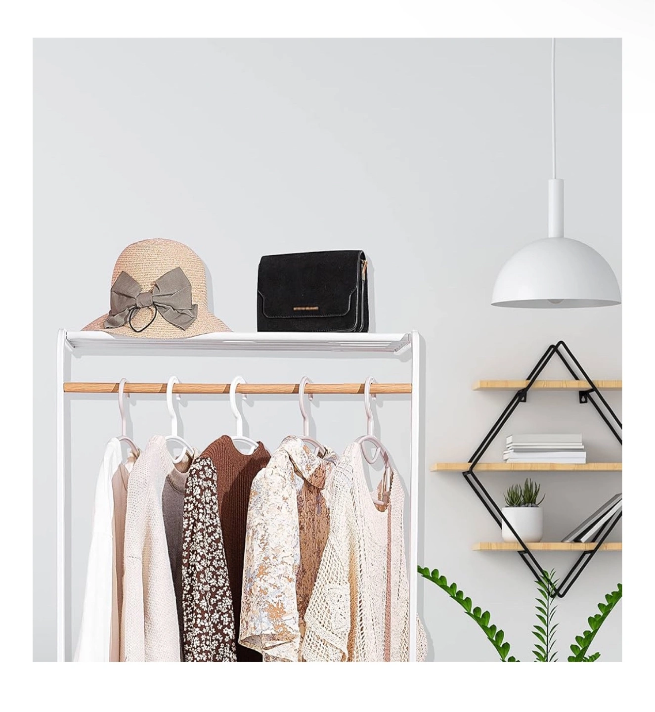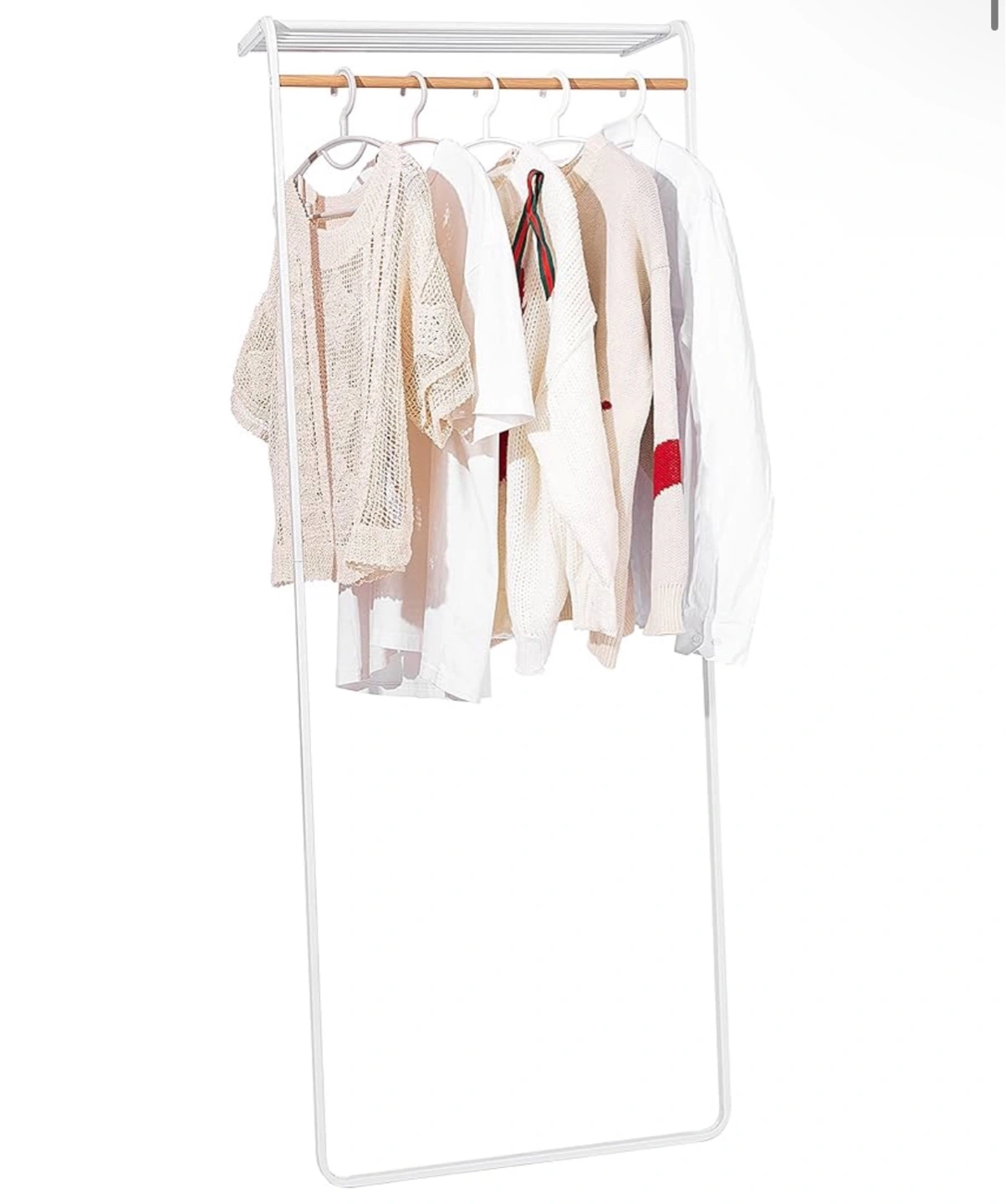 I'm selling a clothes rack that is perfect for organizing your wardrobe! It features a sleek white metal frame with a wooden bar for hanging clothes. The dimensions are approximately 63 inches tall, 26.62 inches wide, and 18.11 inches deep. *Door pickup only — 4th fl walk-up, no elevator. Please bring help or do a quick double park if needed. Thank you.