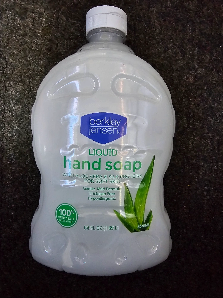 I'm selling a bottle of Berkley Jensen liquid hand soap. It contains aloe vera and silk proteins for soft skin. It's a gentle, mild formula that's triclosan-free and hypoallergenic. The bottle contains 64 fl oz (1.89 L)