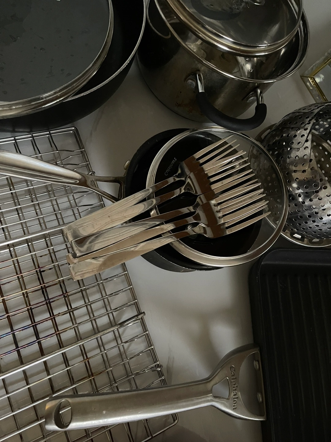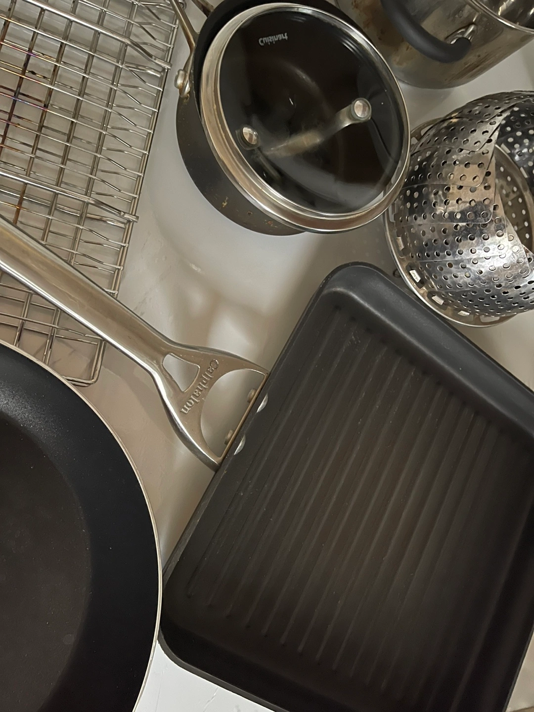 - 11” grill pan (Calphalon Premier Hard-Anodized Nonstick) (Light Use: good condition)