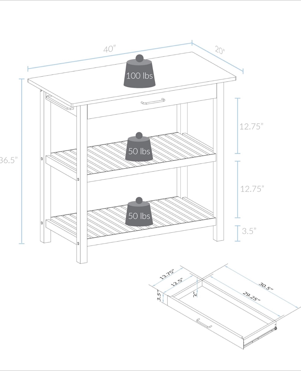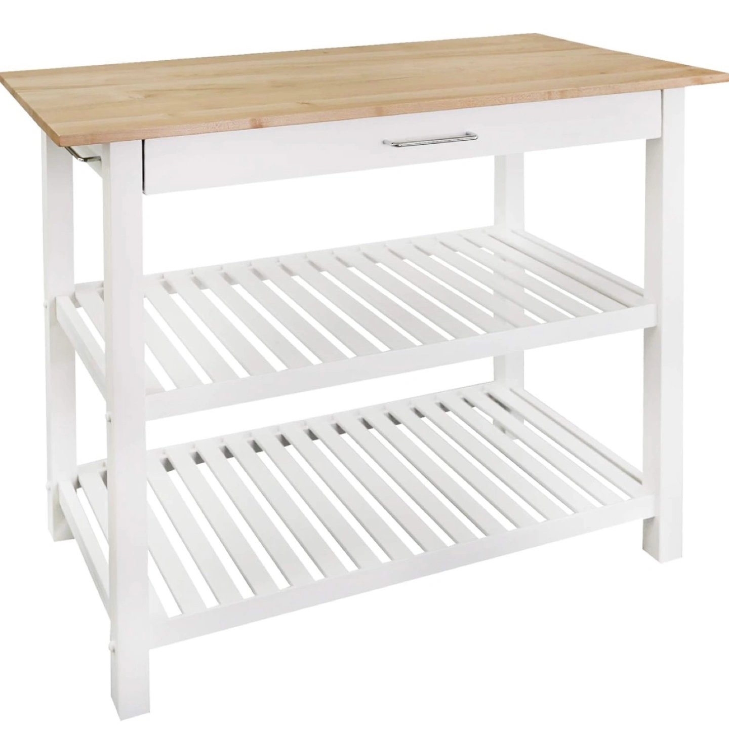 Selling a kitchen island and two matching bar stools! The island is white with a butcher block top and features a drawer and two shelves for storage. The stools are also white with wooden seats. Island dimensions are approximately 40" x 20" x 36.5".