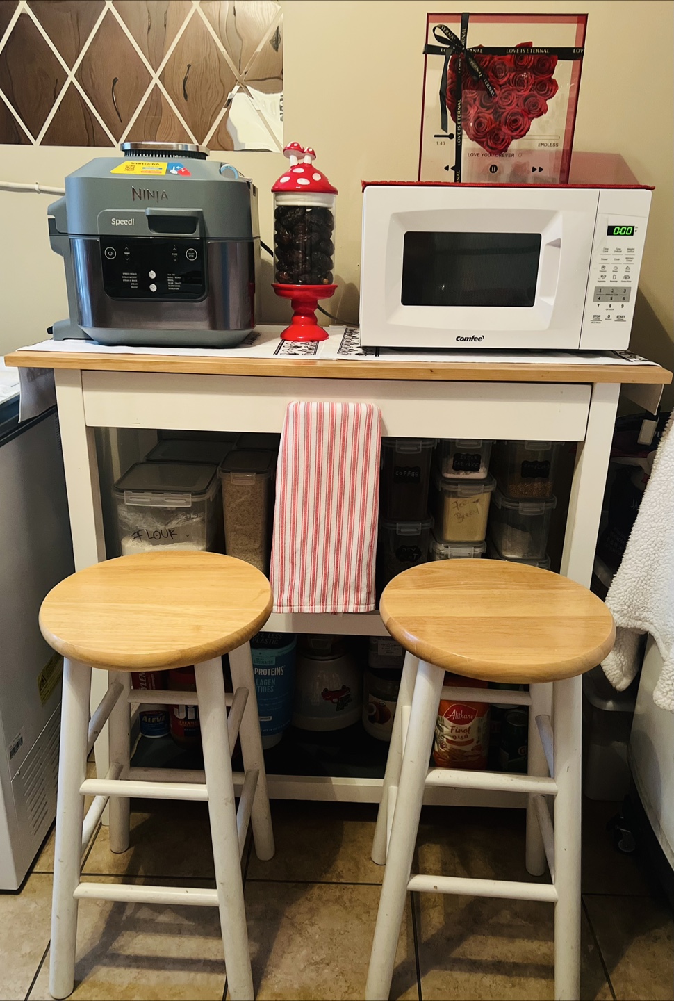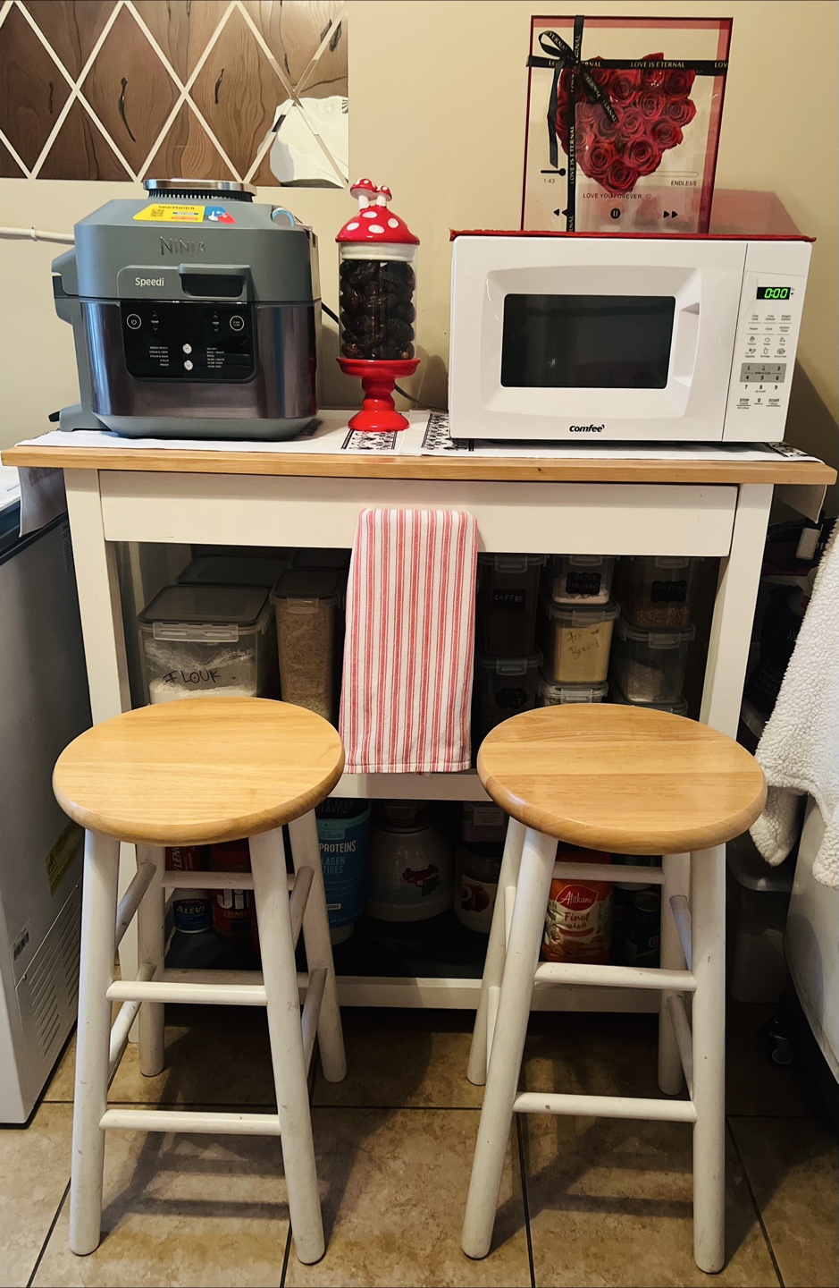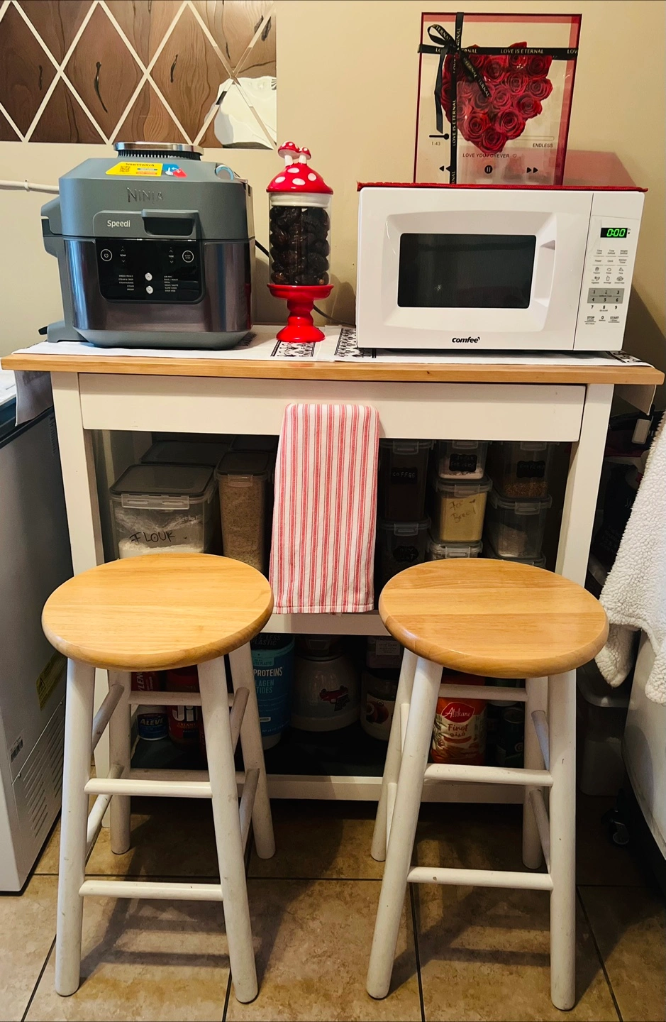 White Kitchen Island with Two Bar Stools