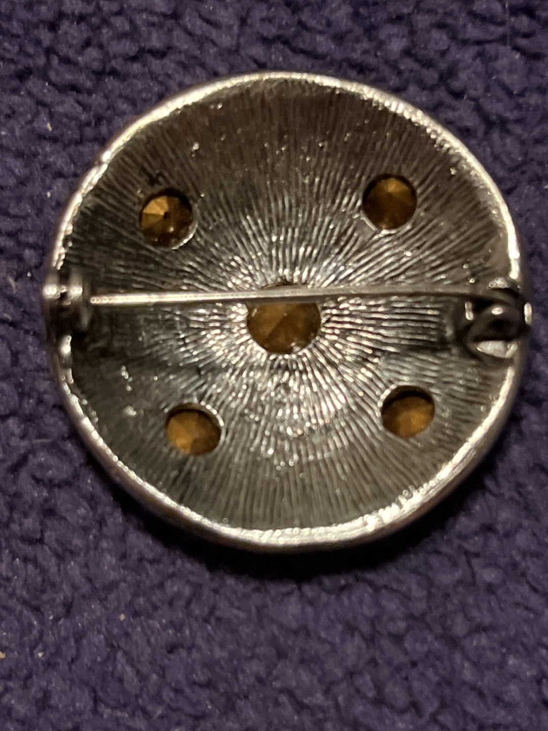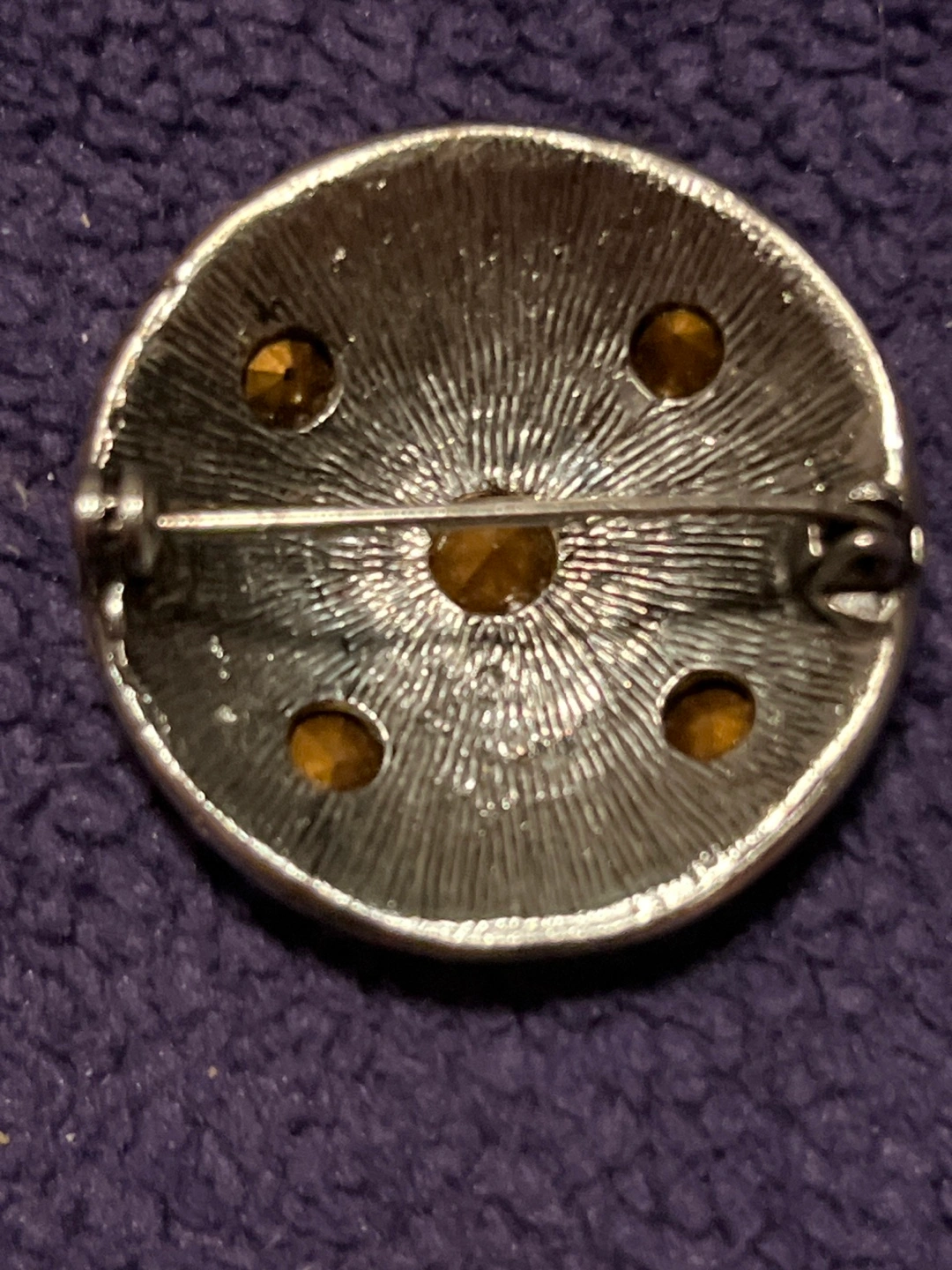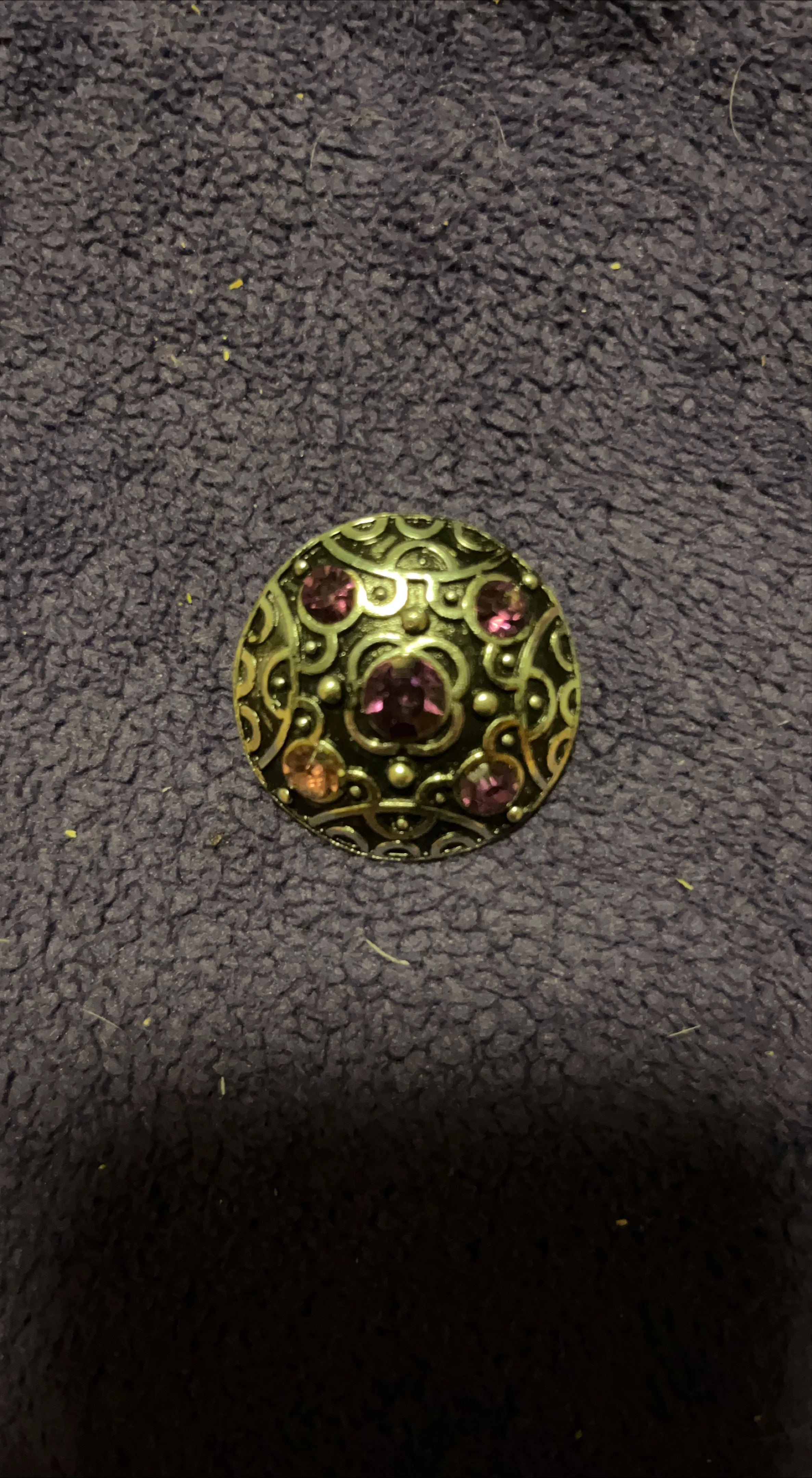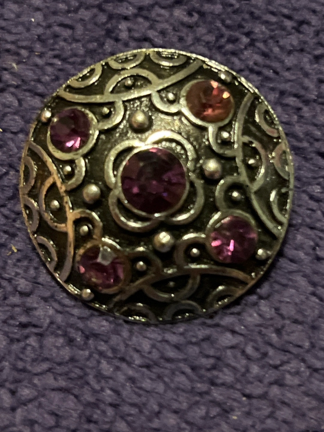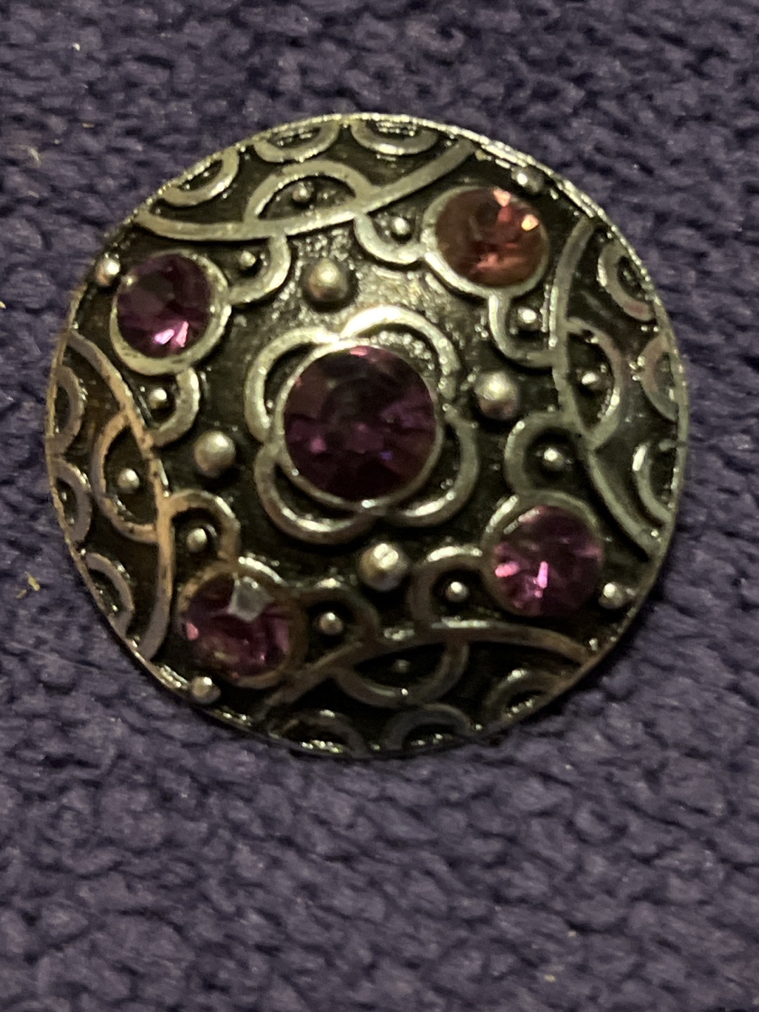 Selling a lovely vintage brooch! It features a silver tone metal with an intricate design and purple coloured accents. The back has a secure pin closure. It's in great condition and ready to add a touch of vintage charm to your outfit!