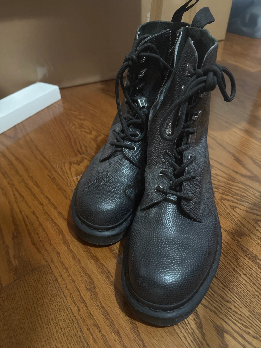 Selling a pair of black leather lace-up boots. They have a textured finish and a classic combat boot style. Perfect for adding a bit of edge to your look! Dr. Martens. Side zipper for easy in and out during winter season.