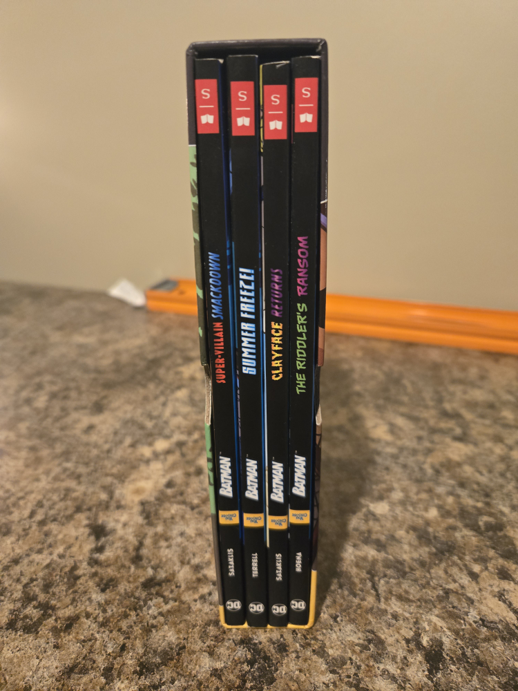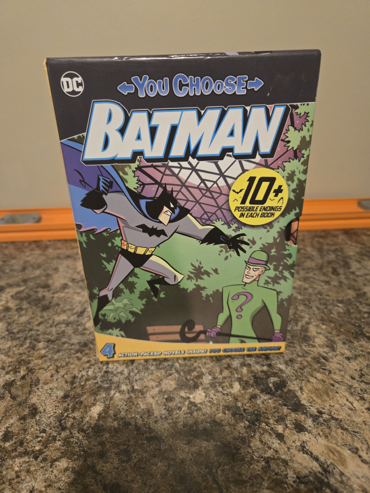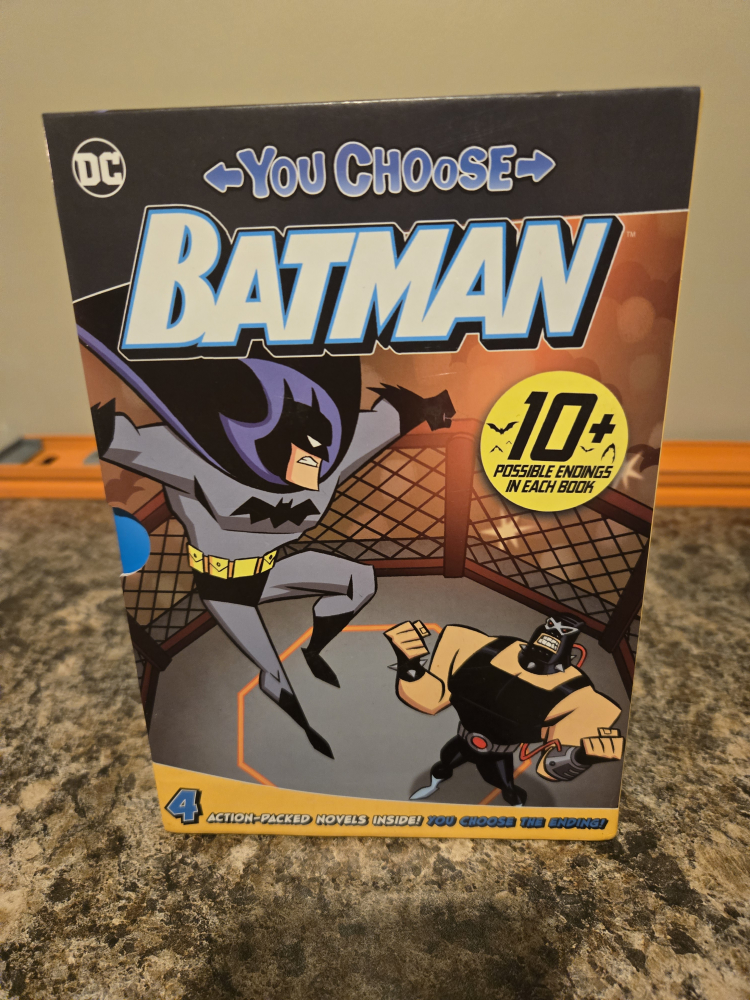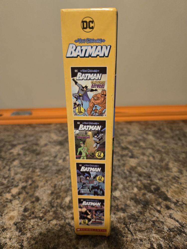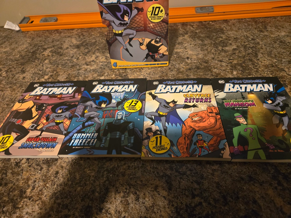 Selling a "You Choose Batman" 4-book set. Each book contains over 10 possible endings! Titles include: Super-Villain Smackdown, Summer Freeze!, Clayface Returns, and The Riddler's Ransom