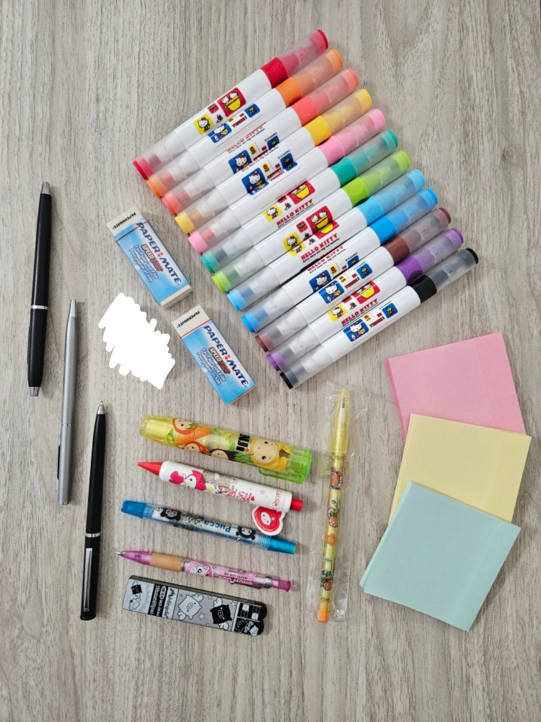 2681. Hello Kitty watercolor markers (12 pcs) 2. Paper Mate erasers (2 pcs) 3. Twist Pens (3 pcs) 4. Lead pencils (3 pcs) 5. Retractable erasers (2 pcs) 6. Lead refill ( 1 container - half full) 7. Sticky notes - pink, yellow, blue All for $5 Message for pick up location