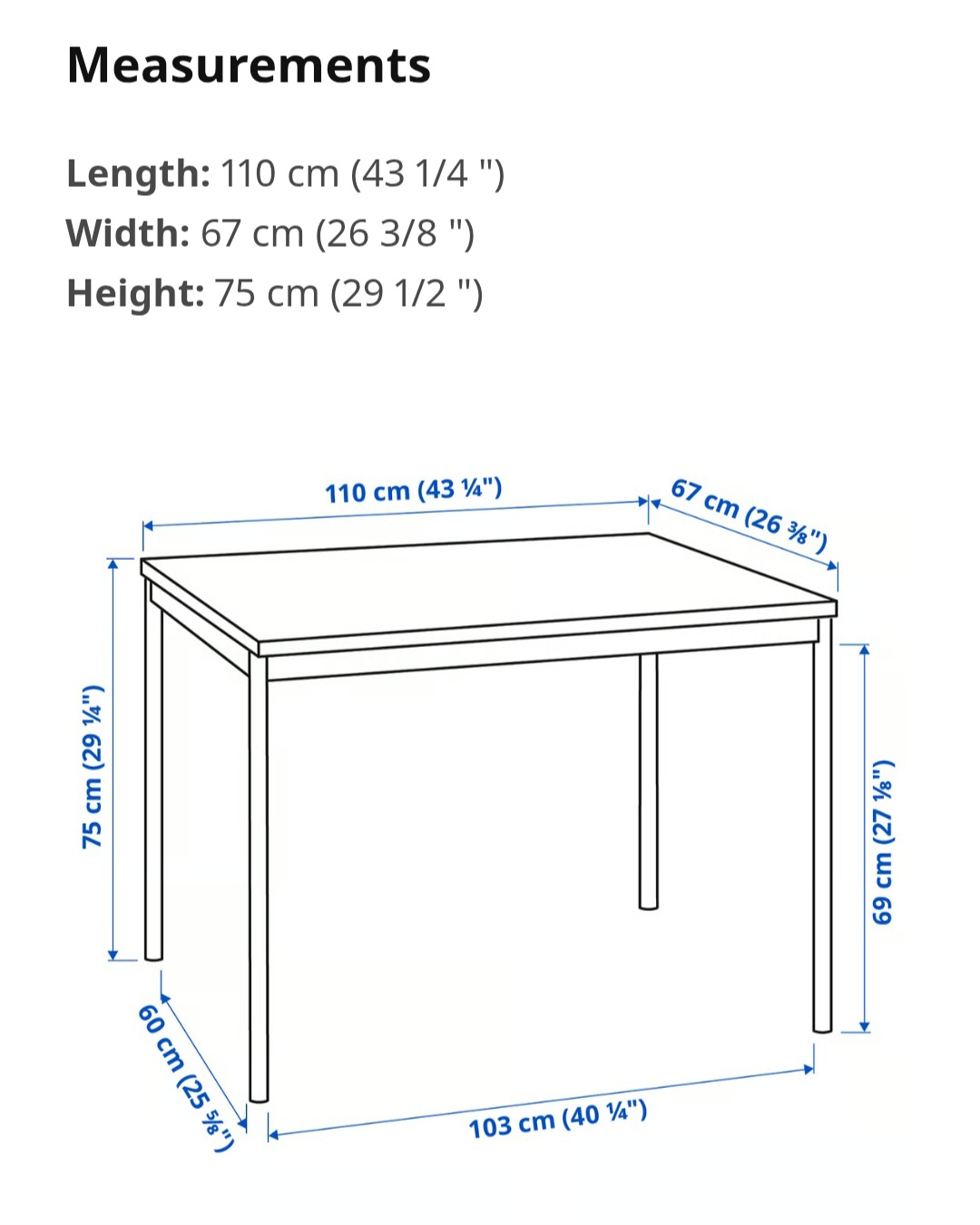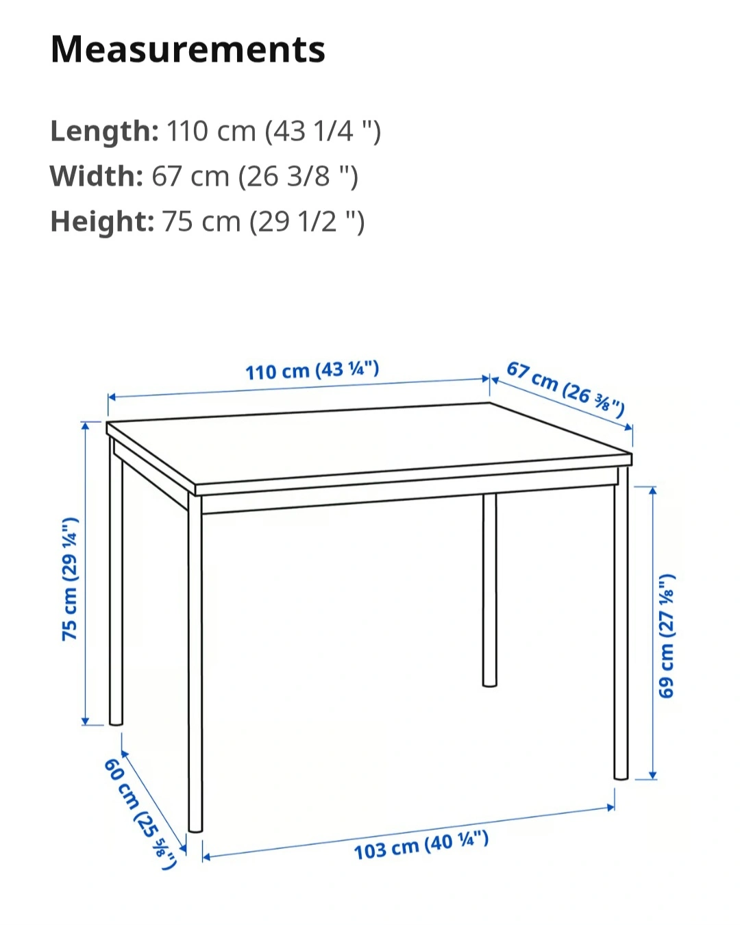 - DimensionsH: 29.13”/74 cm, W: 43.3”/110 cm, D: 26.4”/67cm