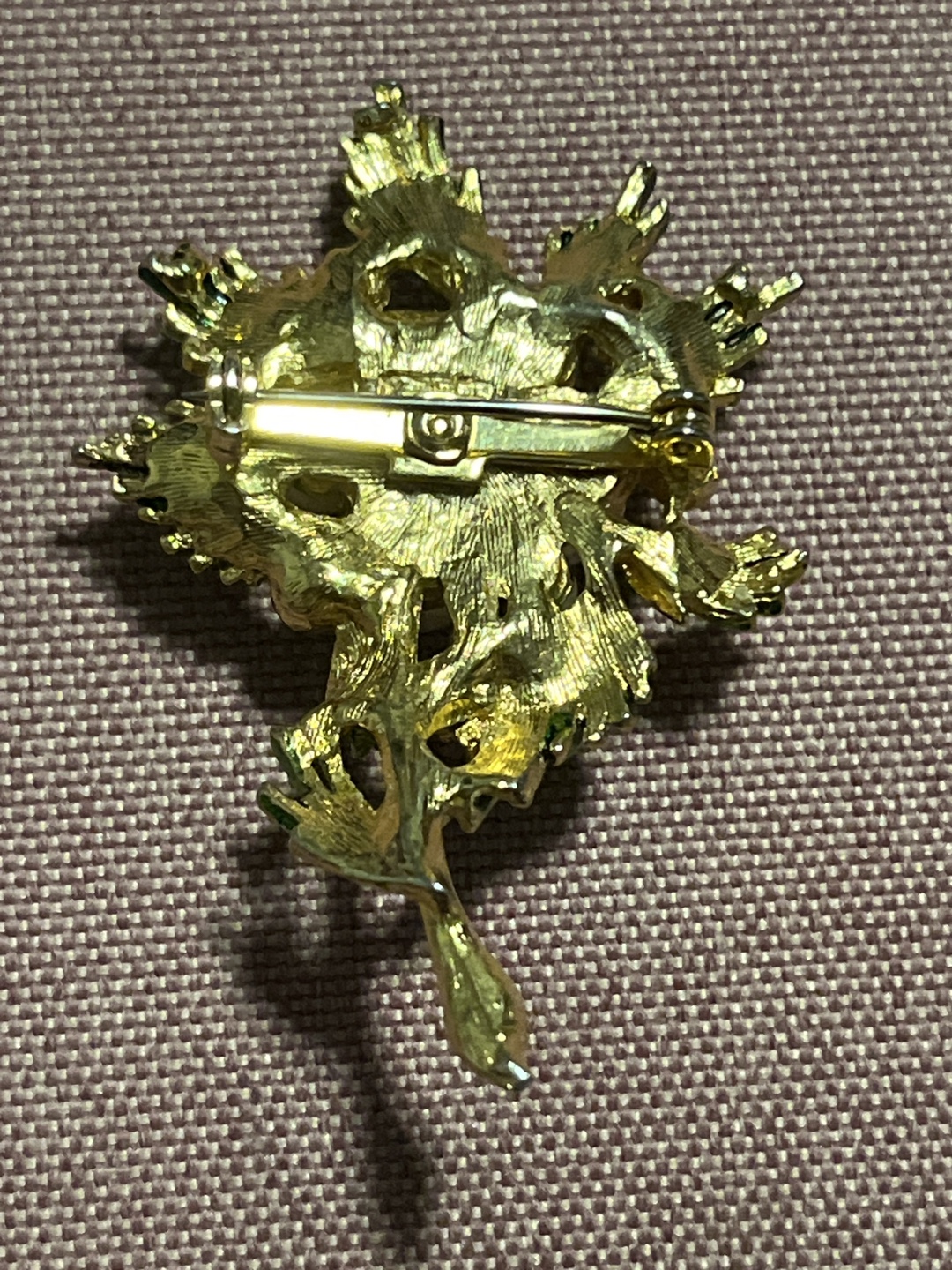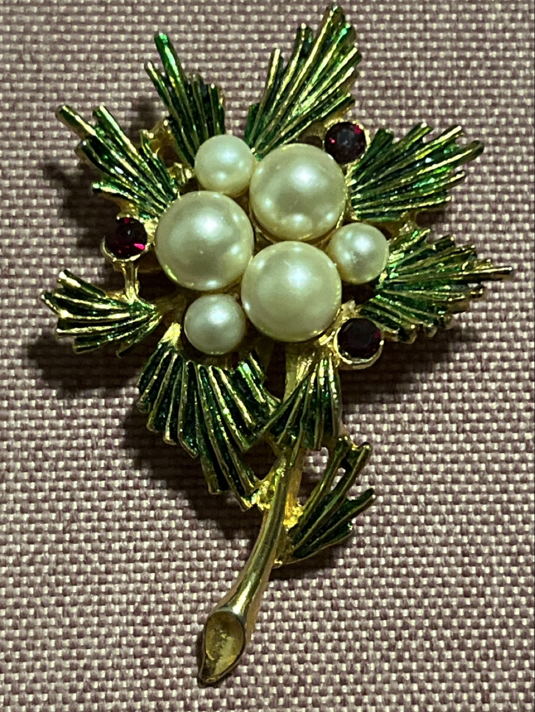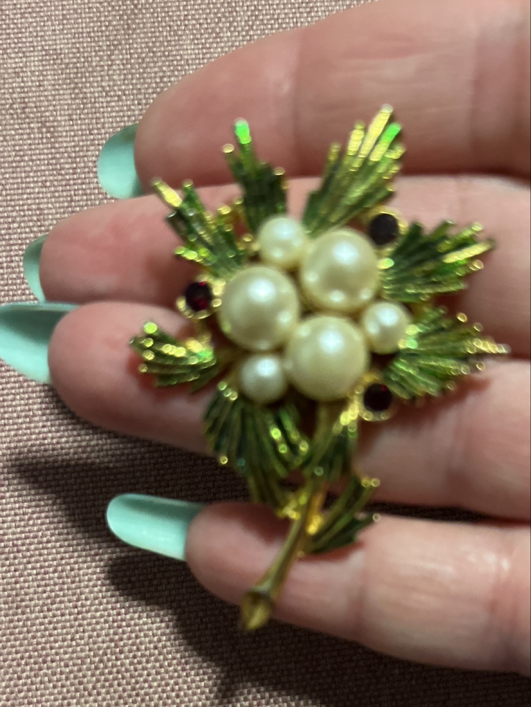 This is a vintage gold-tone holly brooch. It features green enamel leaves, faux pearls, and small red rhinestones. It would be a lovely addition to any outfit or collection!