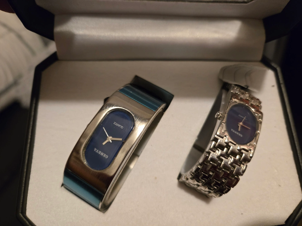 Selling a set of two Geneva quartz watches. They come in a box, making it a nice set! One watch has a blue and silver band, while the other is silver. Both have blue faces