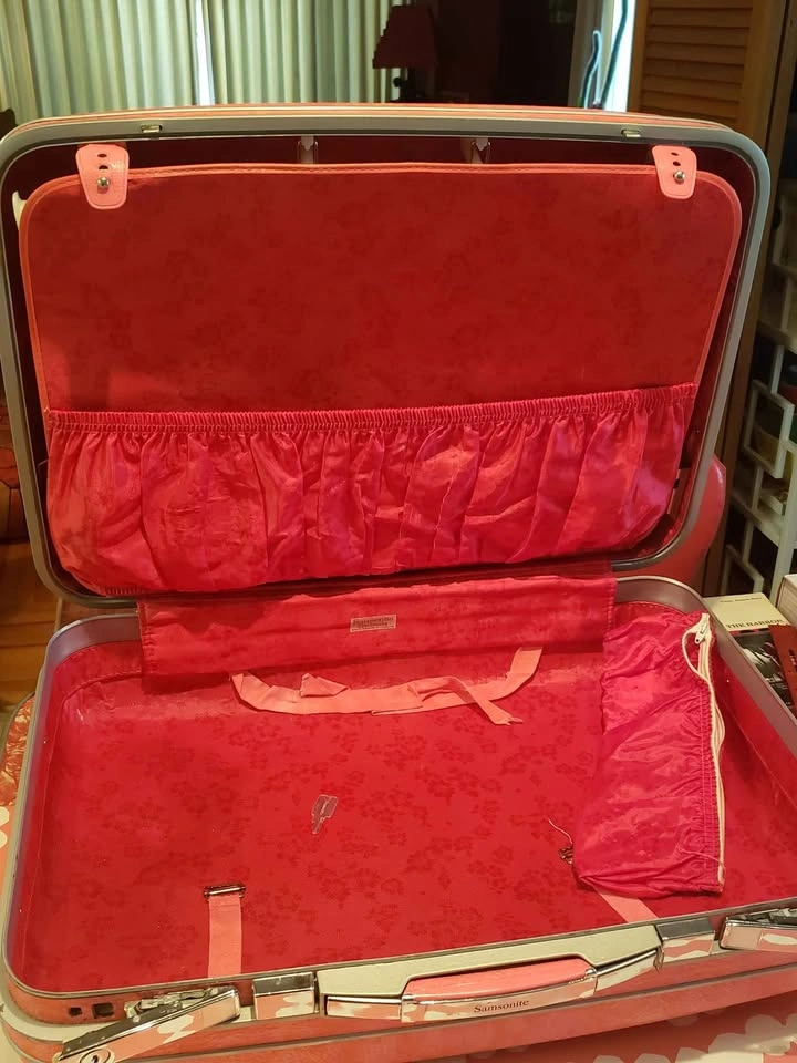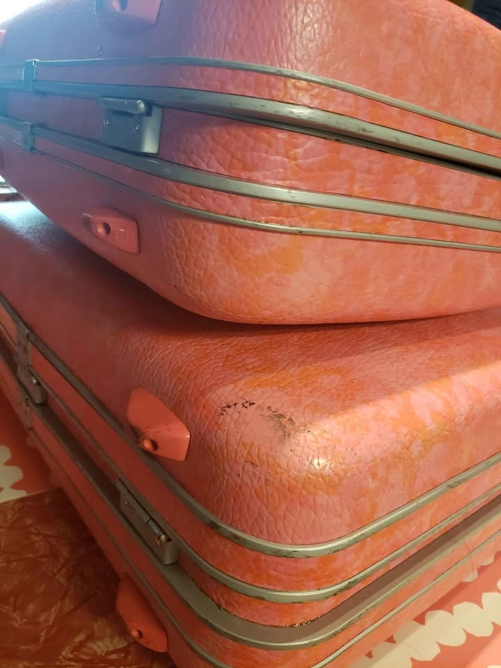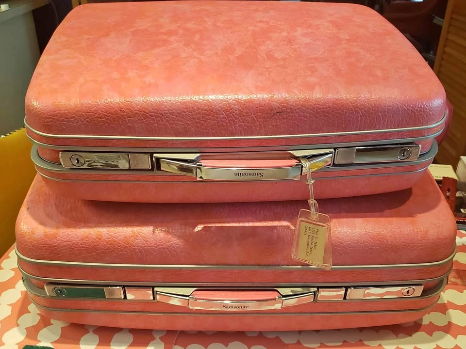 25Matching set of 2 vintage Samsonite Sherbrooke textured hard-shell suitcases from the late 60s/early 70s. Made in Canada. Rare psychedelic pink/orange marble colour with chrome hardware and coral satin floral lining. Both have zippered vanity/makeup cases inside and both still have pink satin ribbons and buckles for securing clothing once packed. Keys for both are included, with working roller bar in the larger case for hanging clothes. Both cases have interior dividers with cute fasteners to hold them in place and large pouches on the bottoms of the dividers for packing small items. Luggage tag from original West Vancouver owner still attached to the handles for a bit of nostalgia. Large case is 22" x 16" x 8" Smaller case is 18" x 14" x 6" Clean, smoke-free home, no cracks or broken hardware. Minor scuffs and chips consistent with age. One interior makeup case has detached on one end but is still included. Perfect for travel, home décor, display, or photo/film props. Asking $180 for the set, open to reasonable offers. Pick up in Upper Lonsdale North Vancouver. Cross posted with Marketplace