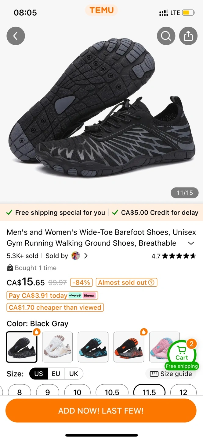 Selling a NEW pair of barefoot shoes in black gray, size 11.5 US or 45 EU. These are great for running, walking, or gym workouts. They're designed to be breathable and comfortable. Comes in the original packaging!