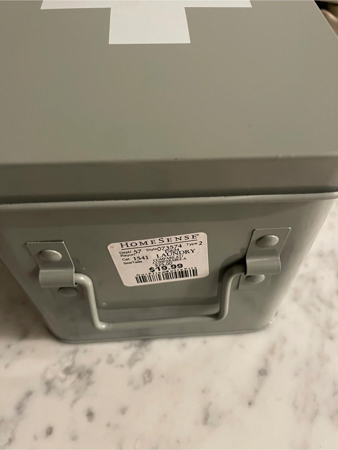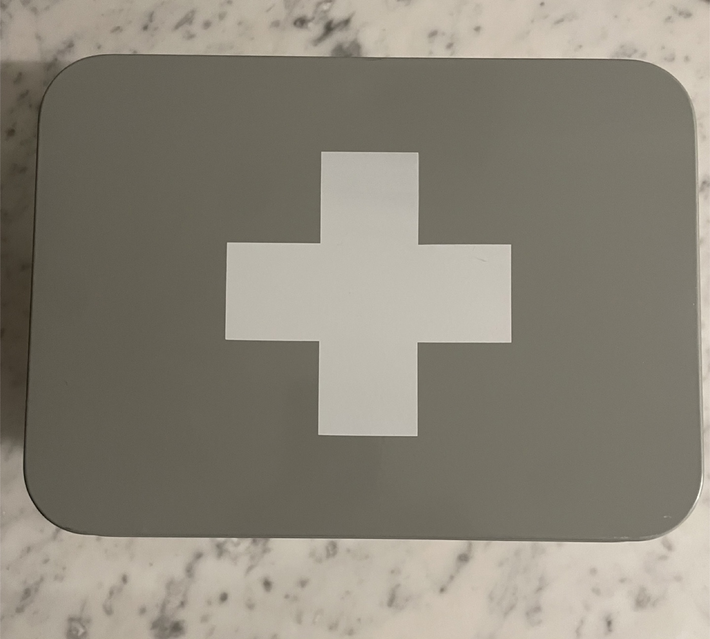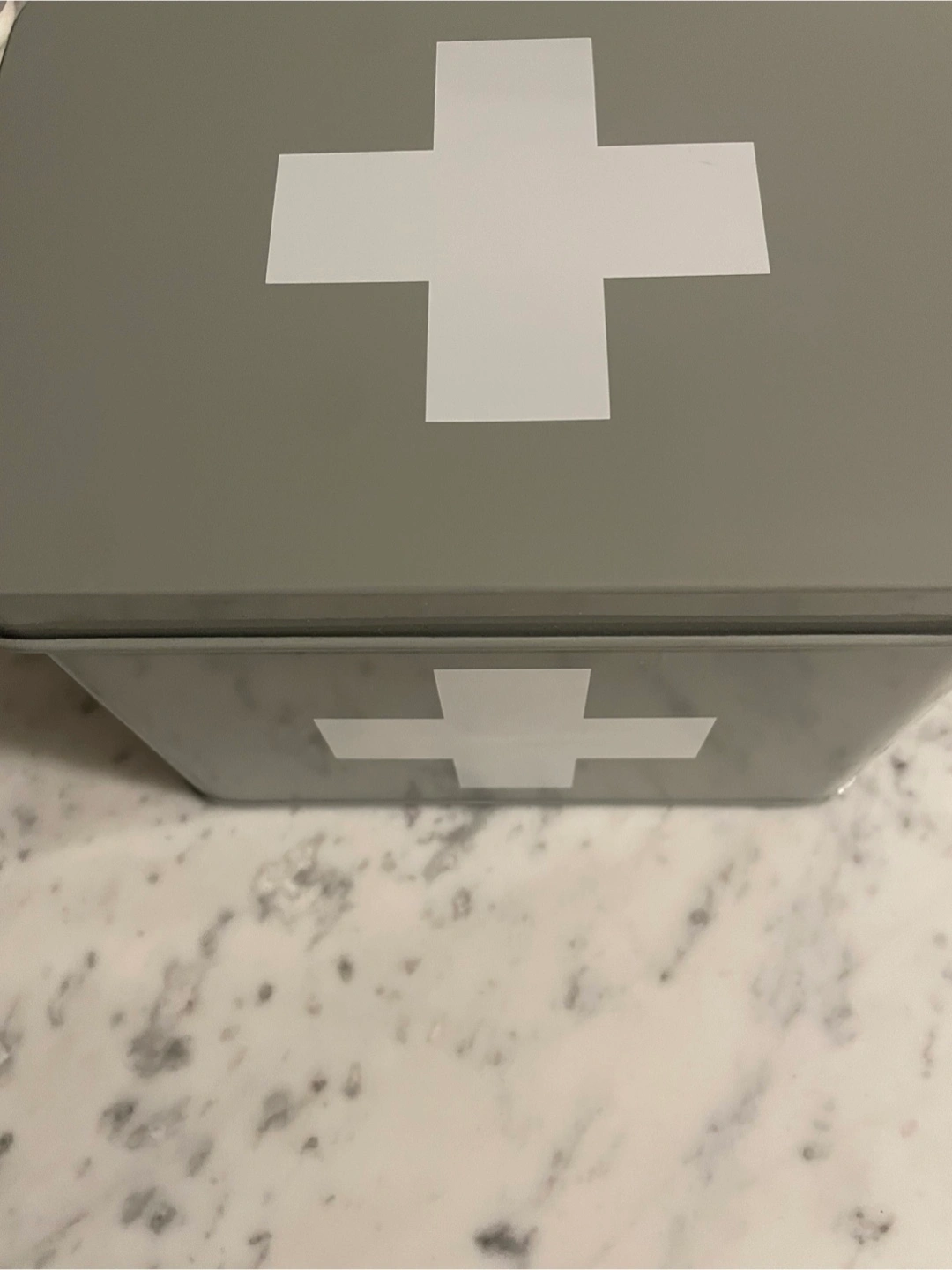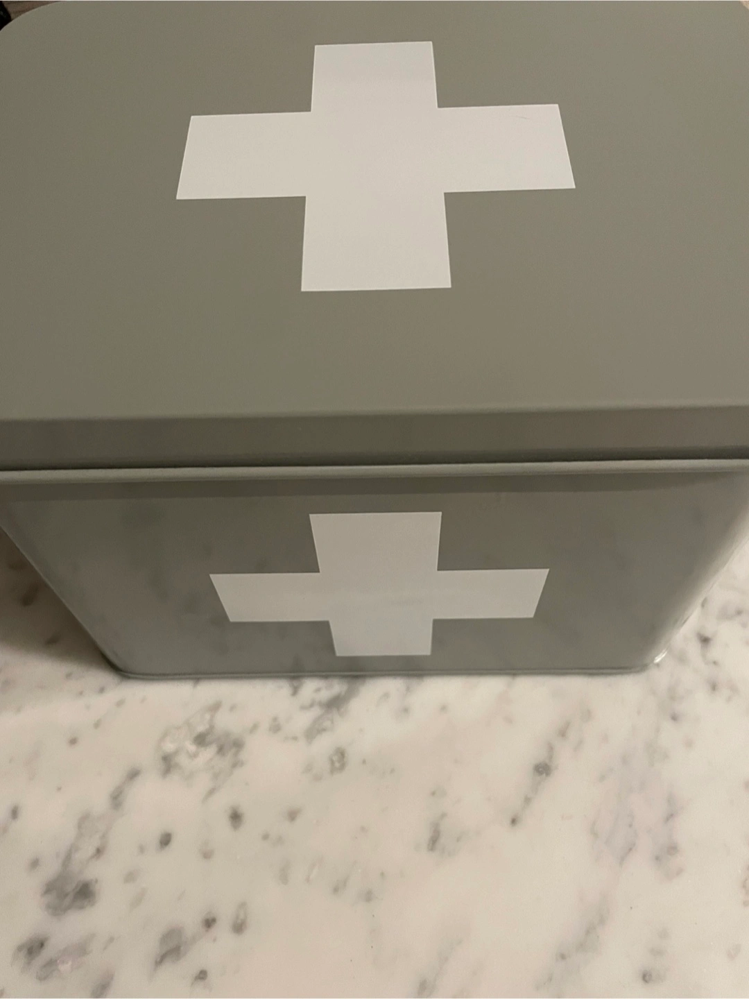 Grey and white first aid/supplies tin box from Homesense. It's a stylish way to keep organized. Originally priced at $19.99. New, never used.
