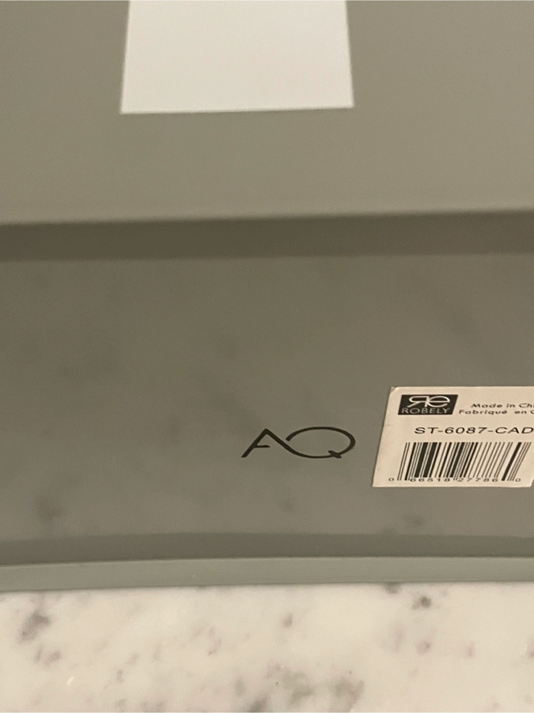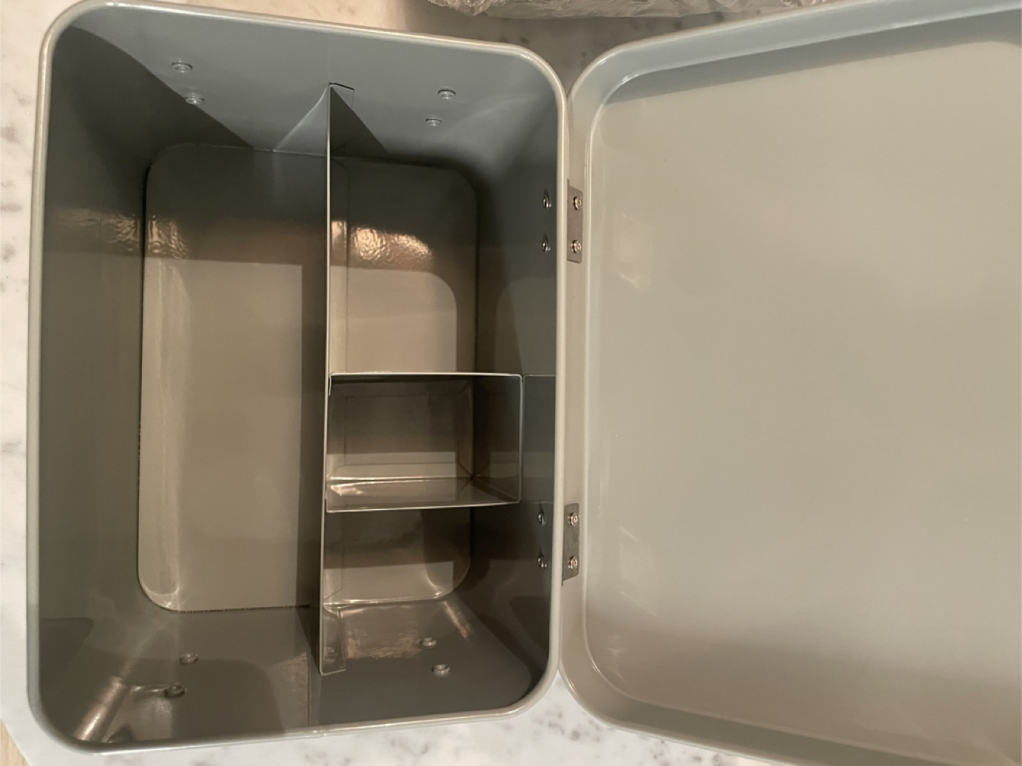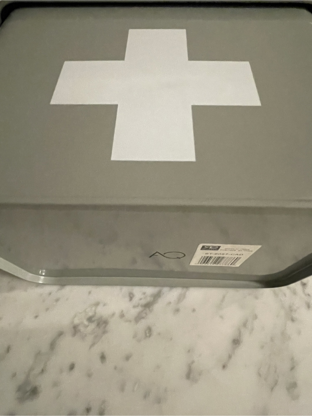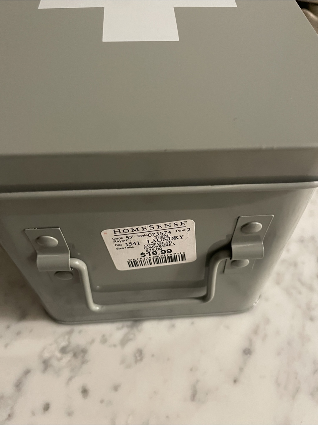 Grey and white first aid/supplies tin box from Homesense. It's a stylish way to keep organized. Originally priced at $19.99. New, never used.
