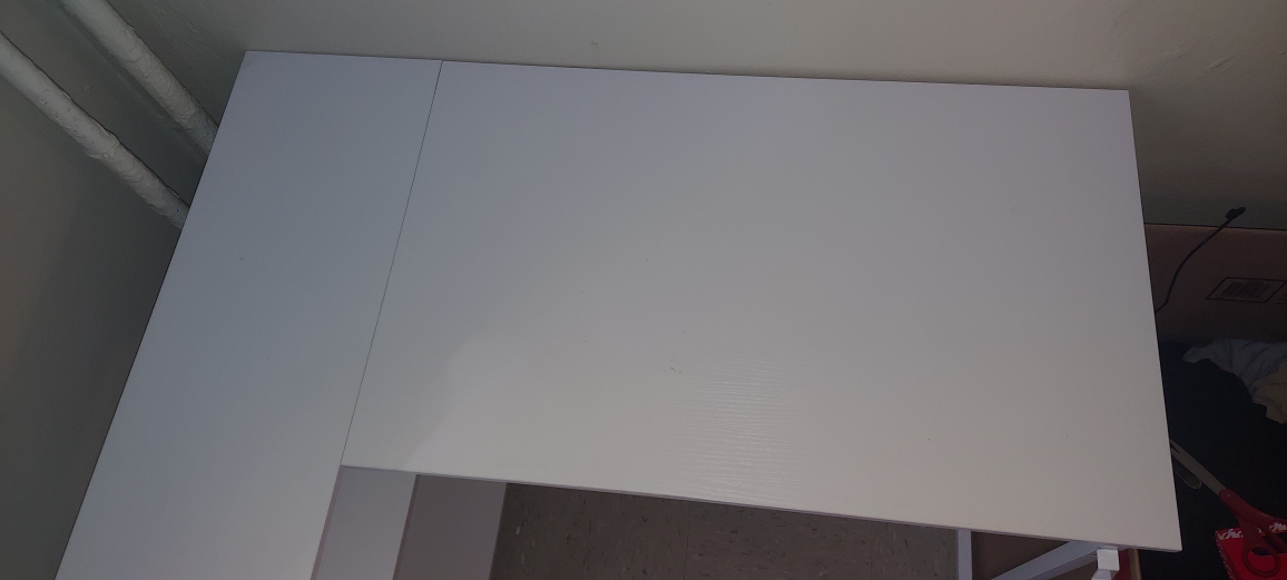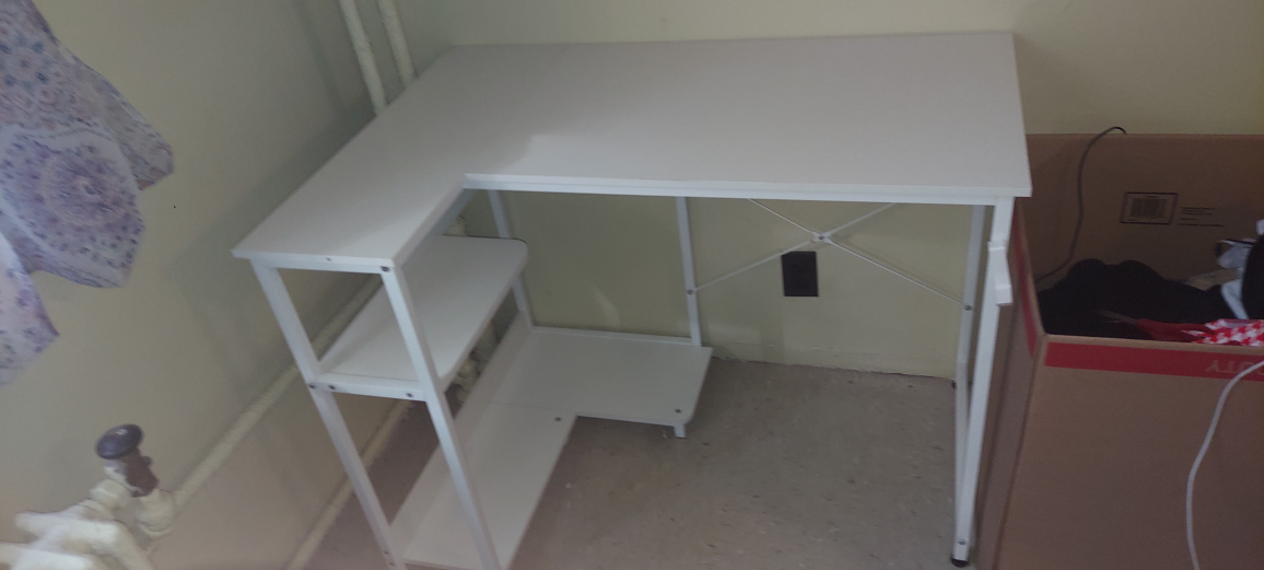 Selling a white corner desk that's perfect for small spaces! It has built-in shelves for extra storage. It's in good condition and ready for a new home