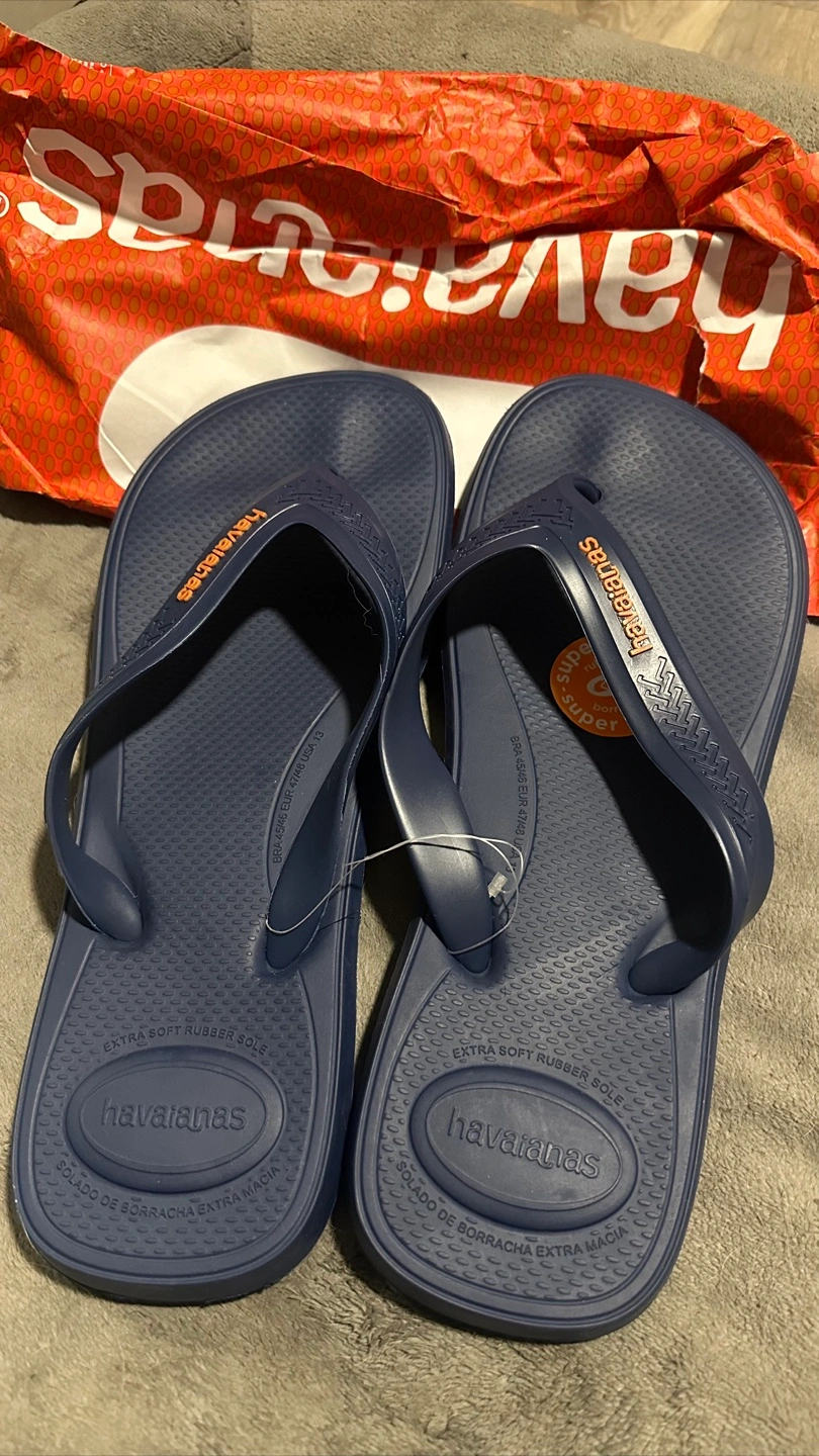 These Havaianas flip flops feature an extra soft rubber sole for added comfort. They're a stylish navy blue colour and are a US size 13. Perfect for summer!