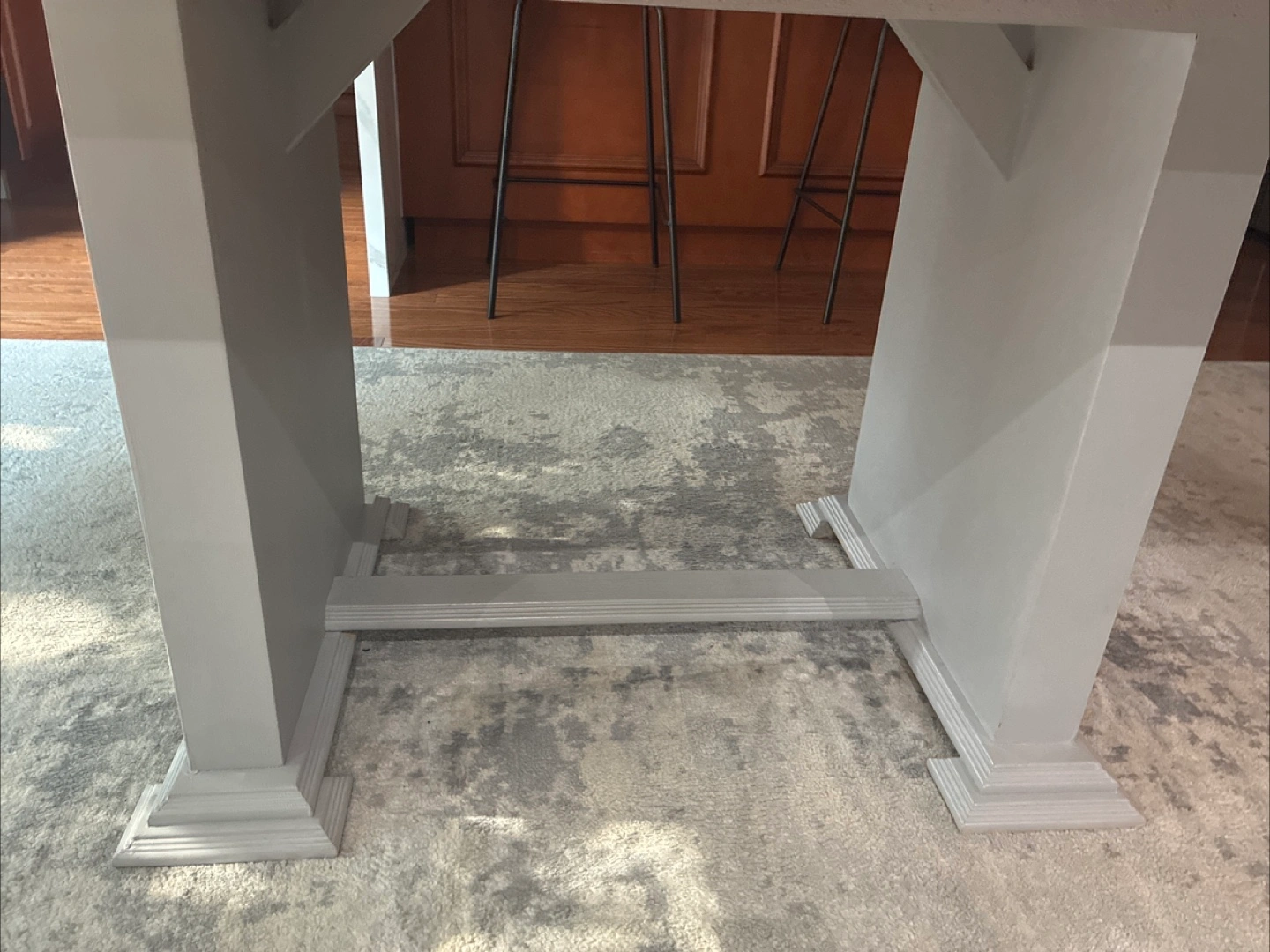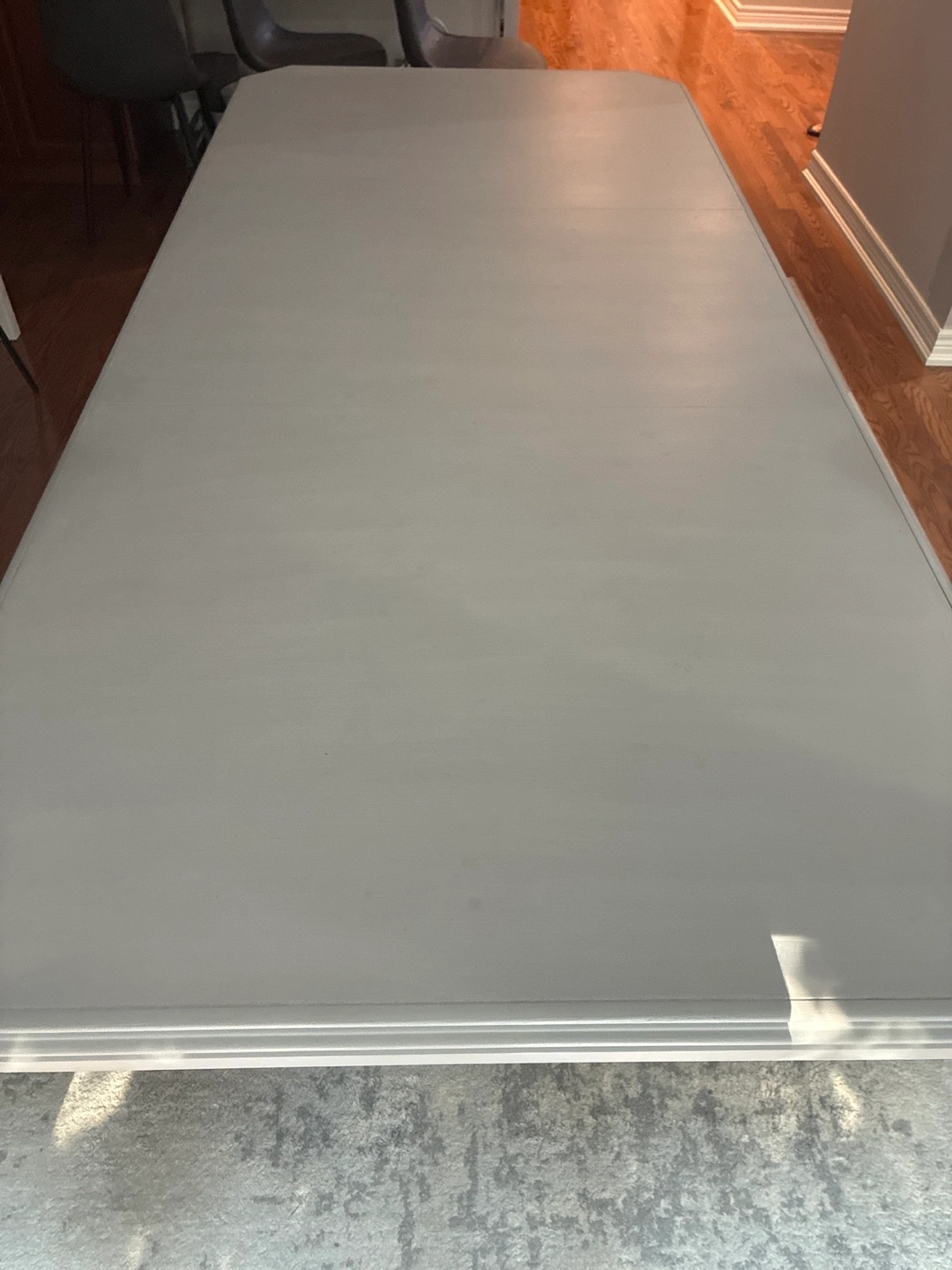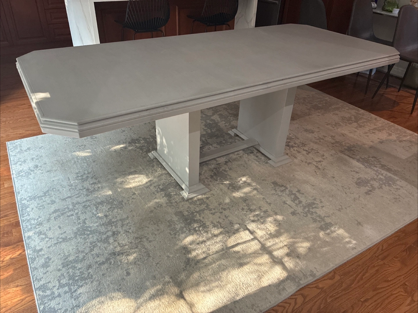 Selling a wood dining table in a neutral grey colour. It's in great shape and would be a lovely addition to any dining room or kitchen. The table is sturdy and has a modern look. Perfect for family dinners or entertaining friends! It has a leaf insert, so size can be adjusted to accommodate your needs.