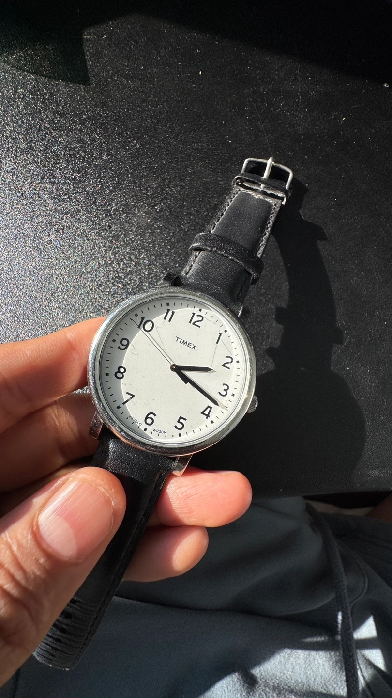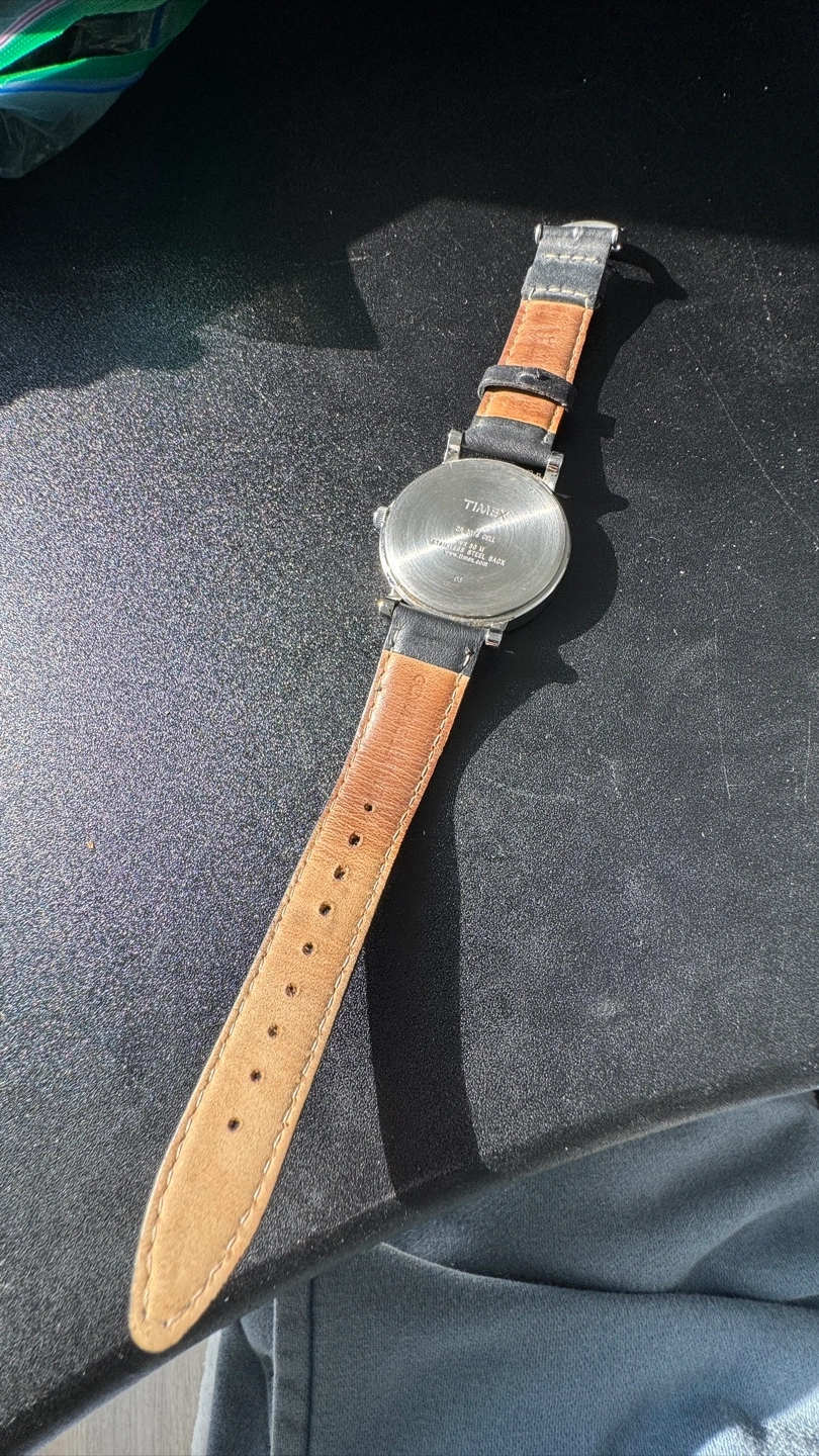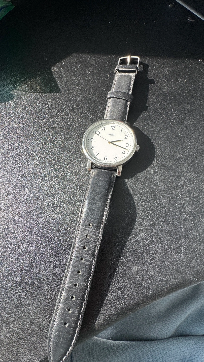 Selling a Timex watch with a black leather band. It's a classic style, perfect for everyday wear. The band shows some signs of wear, but the watch face is in good condition. A reliable timepiece!