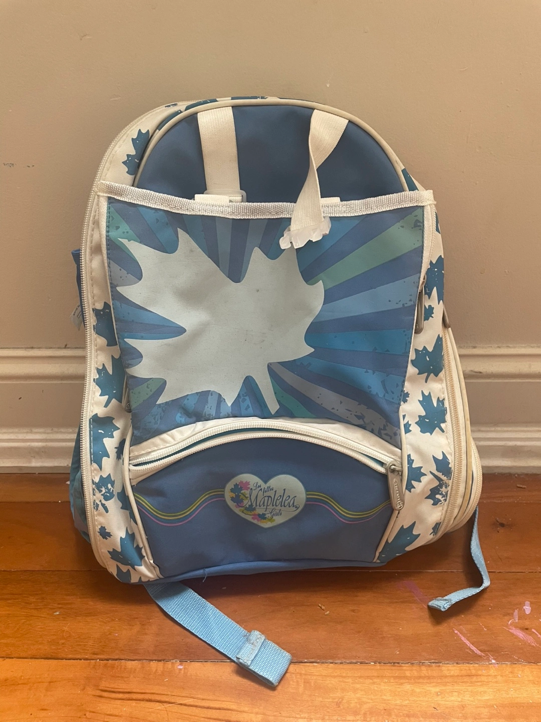 A cute blue and white backpack featuring the Little Maplelea Girl logo. Perfect for a little one, with lots of compartments and adjustable straps. Fits doll and accessories!