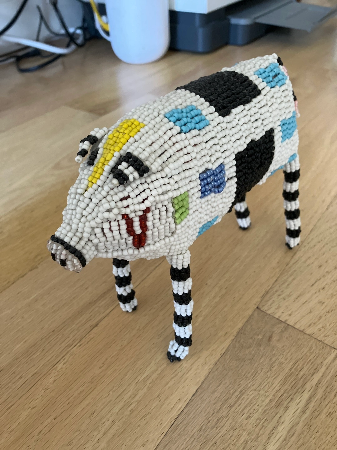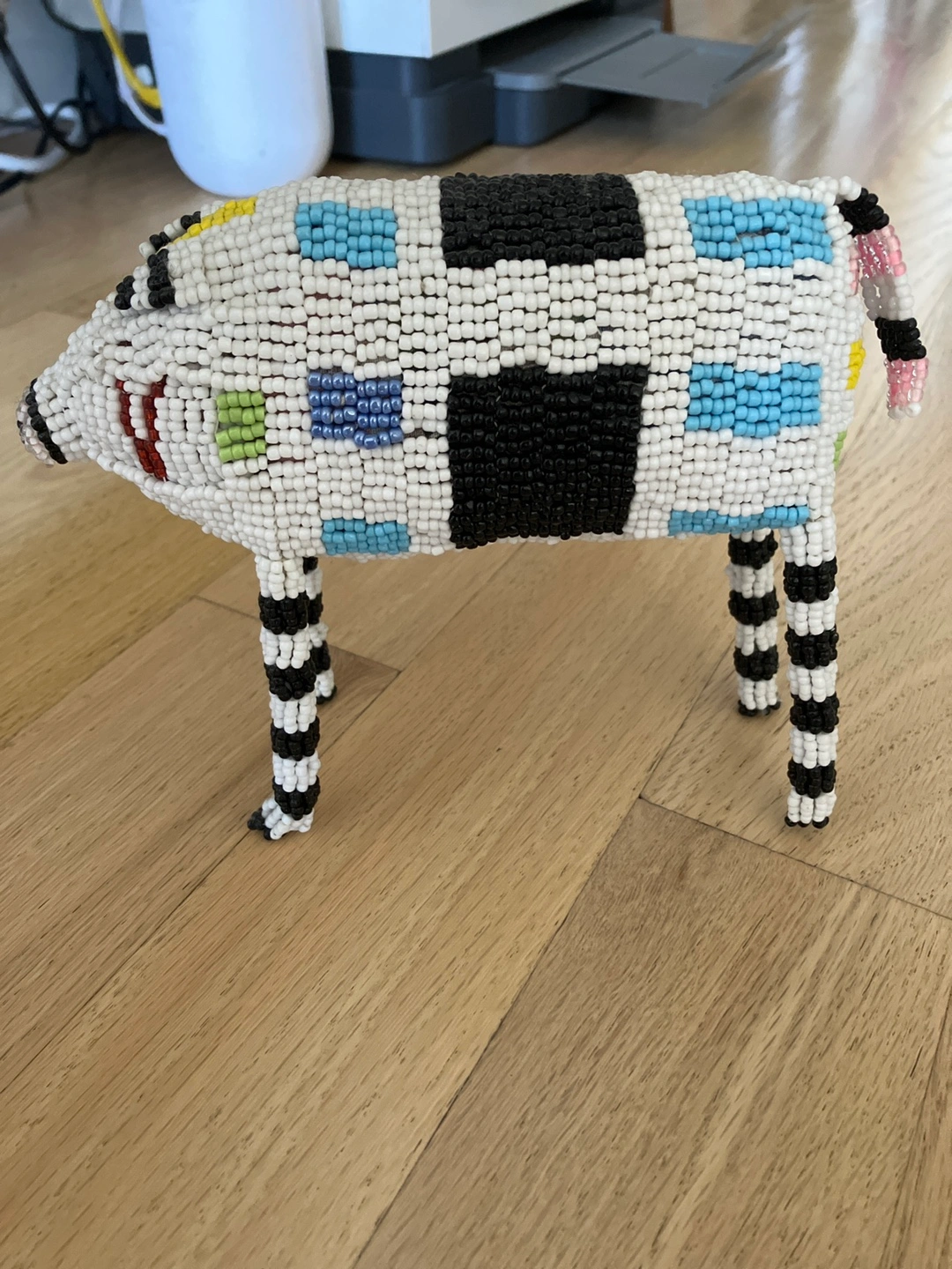 It's a fun and colorful piece that would look great on a shelf or desk. The beads are arranged in a playful pattern of black, white, yellow, blue, and green. It's in great condition. it’s about 8inch long, 6in height and 2in wide.