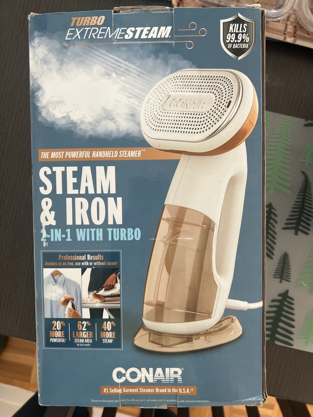 I'm selling a Conair Turbo Extreme Steam & Iron 2-in-1 with Turbo! It's the most powerful handheld steamer. It doubles as an iron, use with or without steam! It kills 99.9% of bacteria. It has 20% more power, 62% larger steam area, and 40% more steam! Bought for $50. Opened it but did not use it.