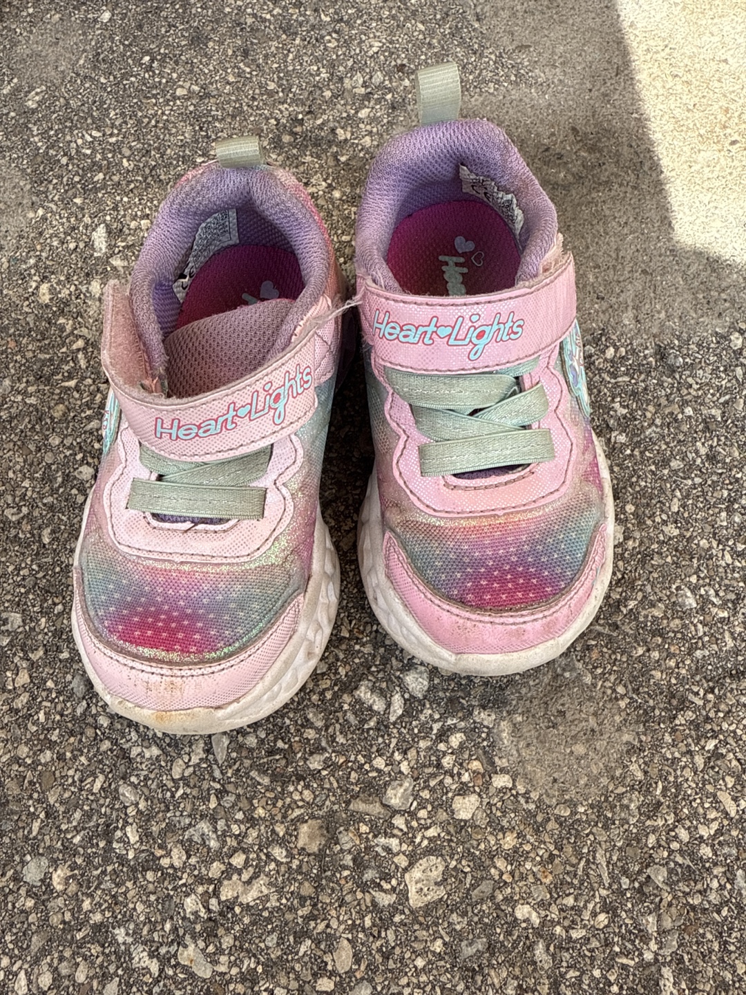 Selling a pair of Skechers Heart Lights toddler shoes in a size 6. They feature a cute pink and rainbow design with light-up hearts on the side. There are some signs of wear, but they're still in good condition for your little one to enjoy! The light up when walking