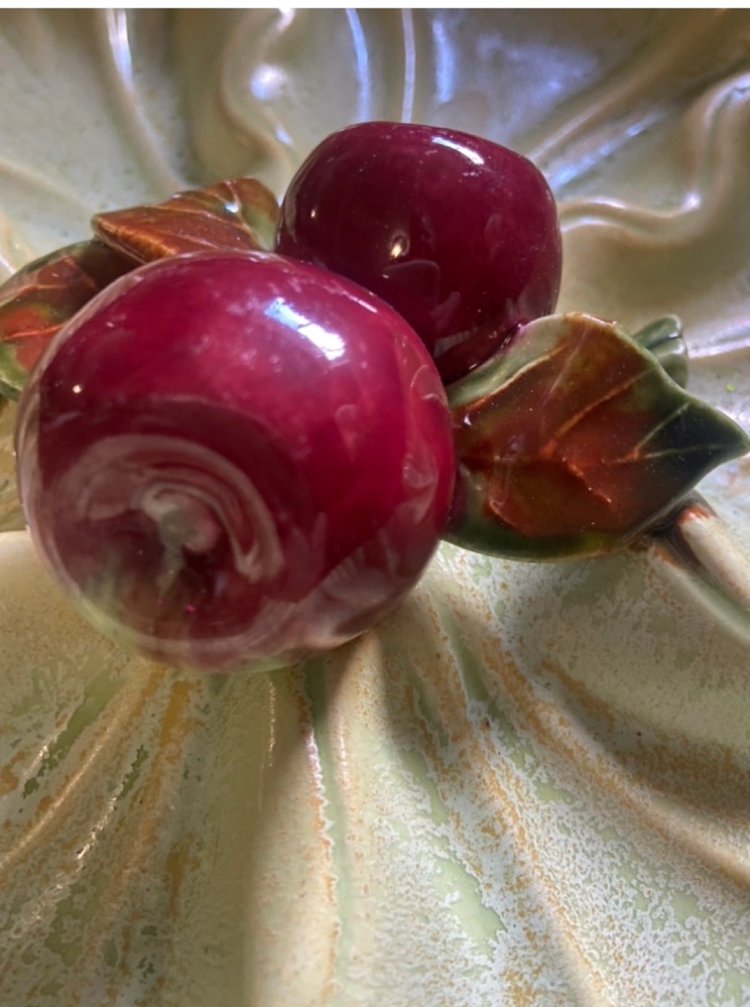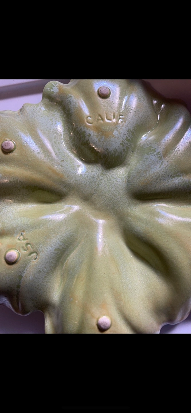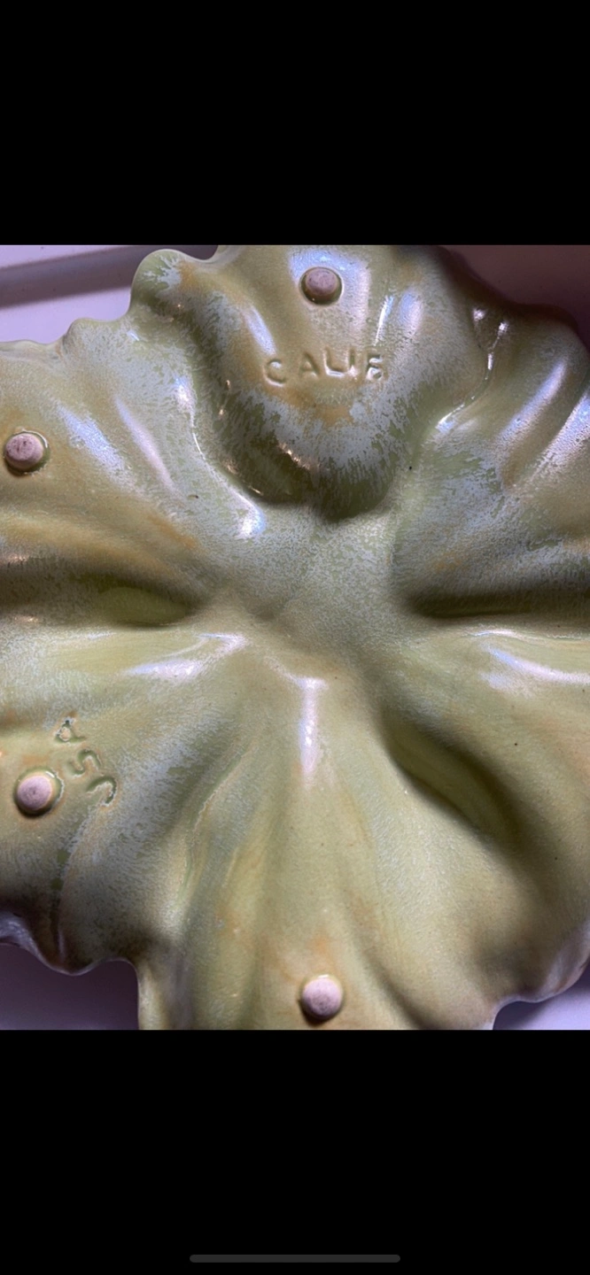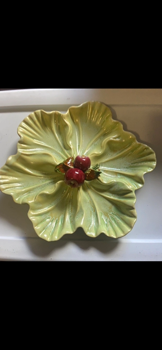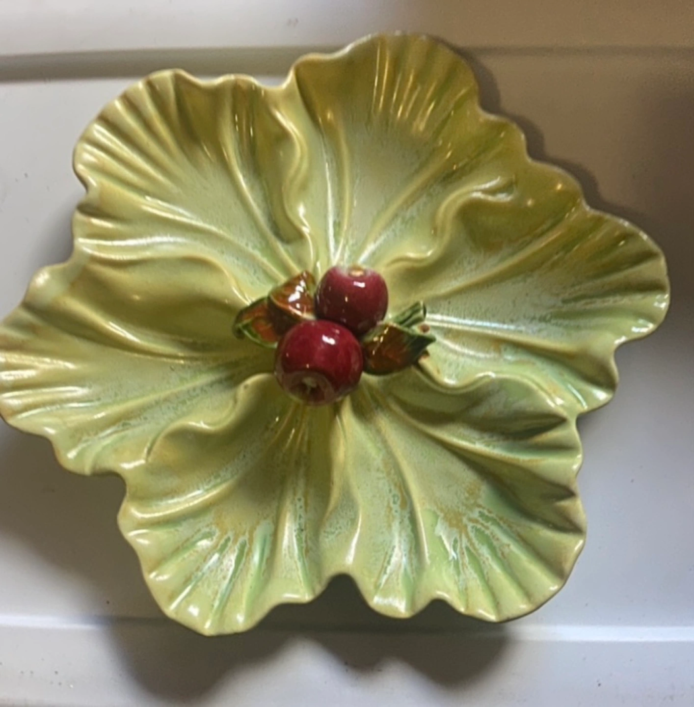 Selling a unique vintage ceramic plate marked 'Calif USA' on the bottom. It features a lovely leaf design with decorative red berries in the centre.