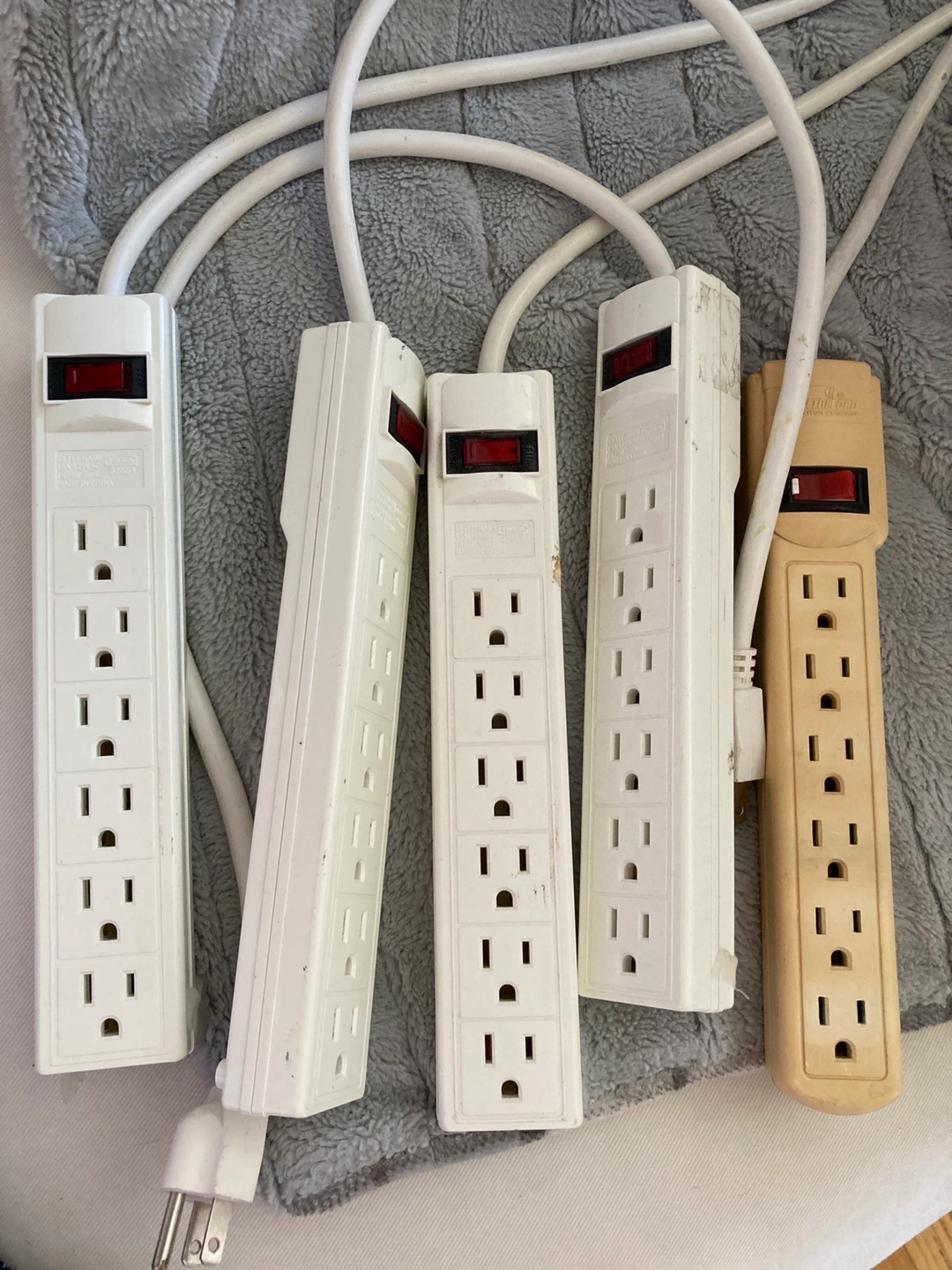 Selling a lot of five power strips. There are four white ones and one beige. All in used condition.