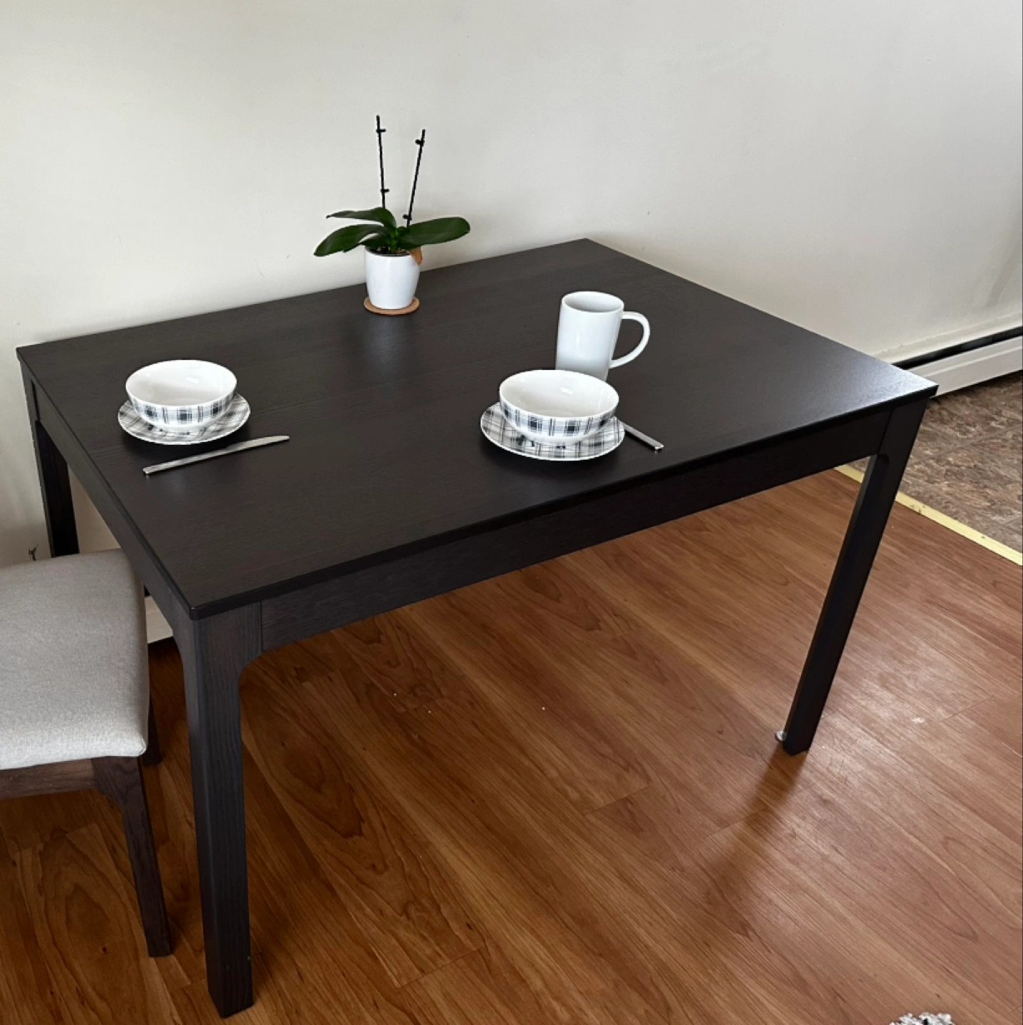Selling IKEA Ekedalen dining table in a dark brown colour. The dining table can be extended up to 180 cm. It's in perfect condition and perfect for a small dining area or kitchen. The table is sturdy and has a simple, modern design that would fit well with any decor.