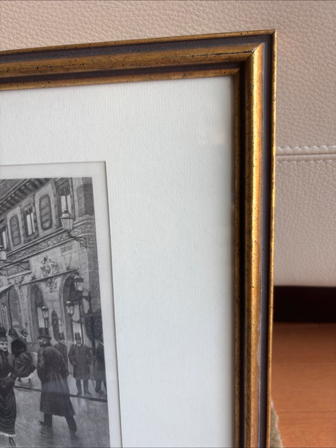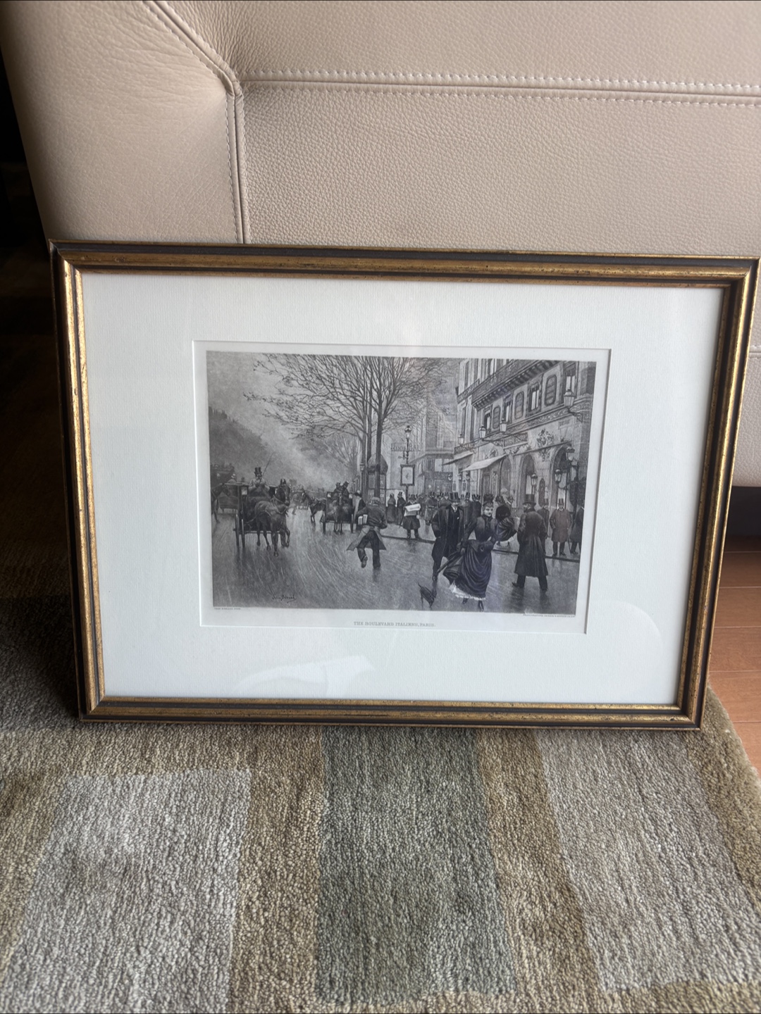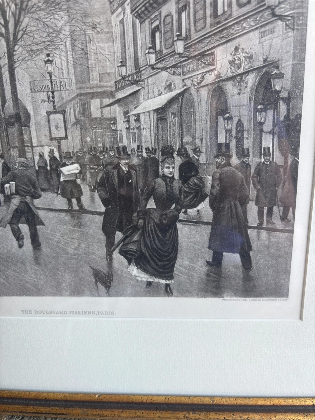 Selling a framed print titled 'The Boulevard Italiens, Paris'. The frame has a lovely wooden gold finish. A sticker on the back indicates it was framed by T. Eaton Co. in 1975. It measures 20 x 15 inches.