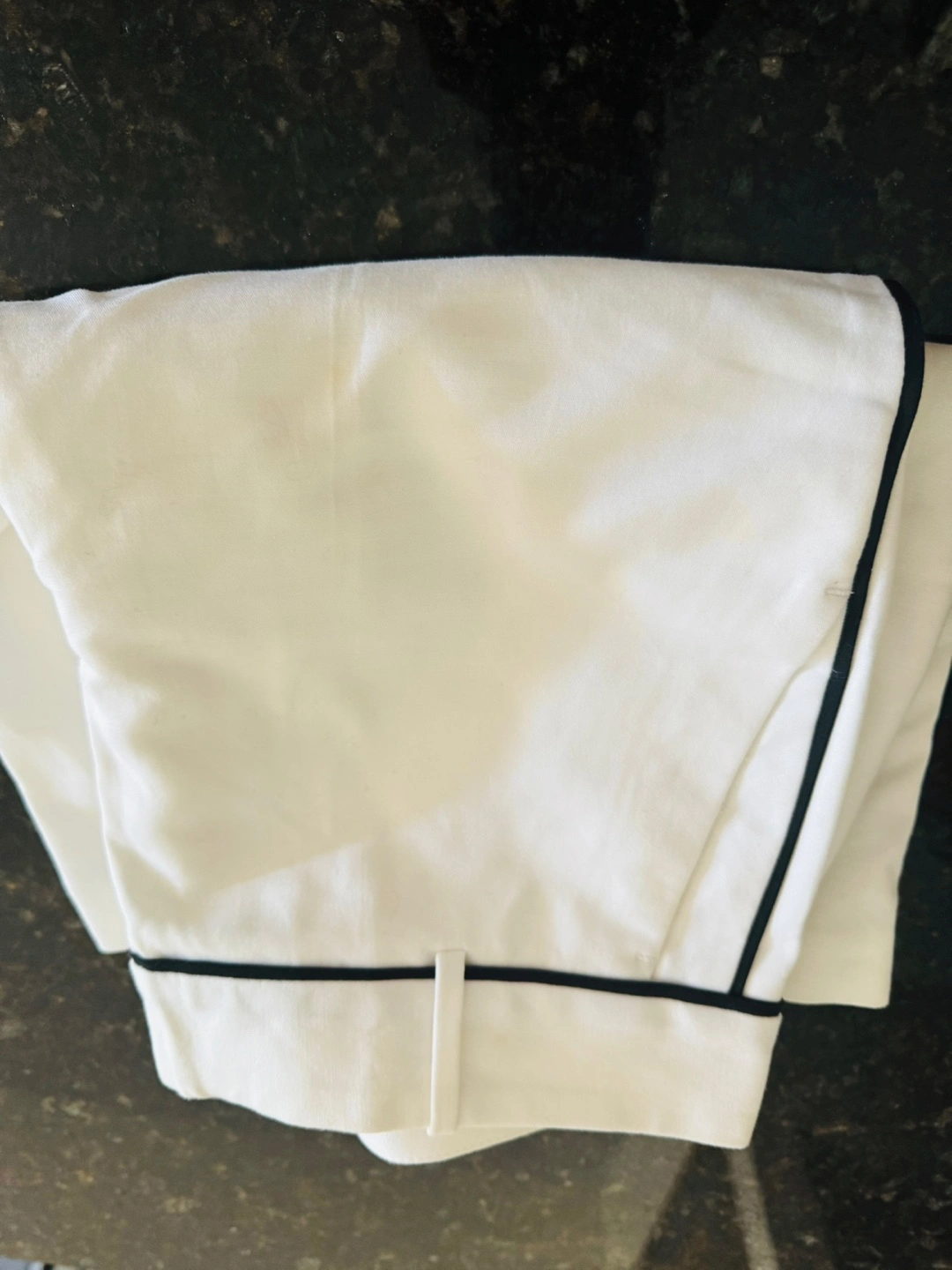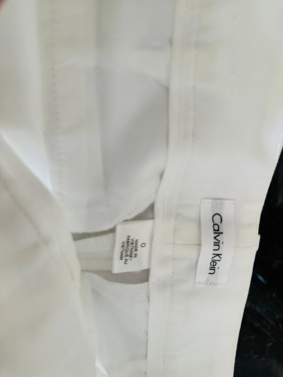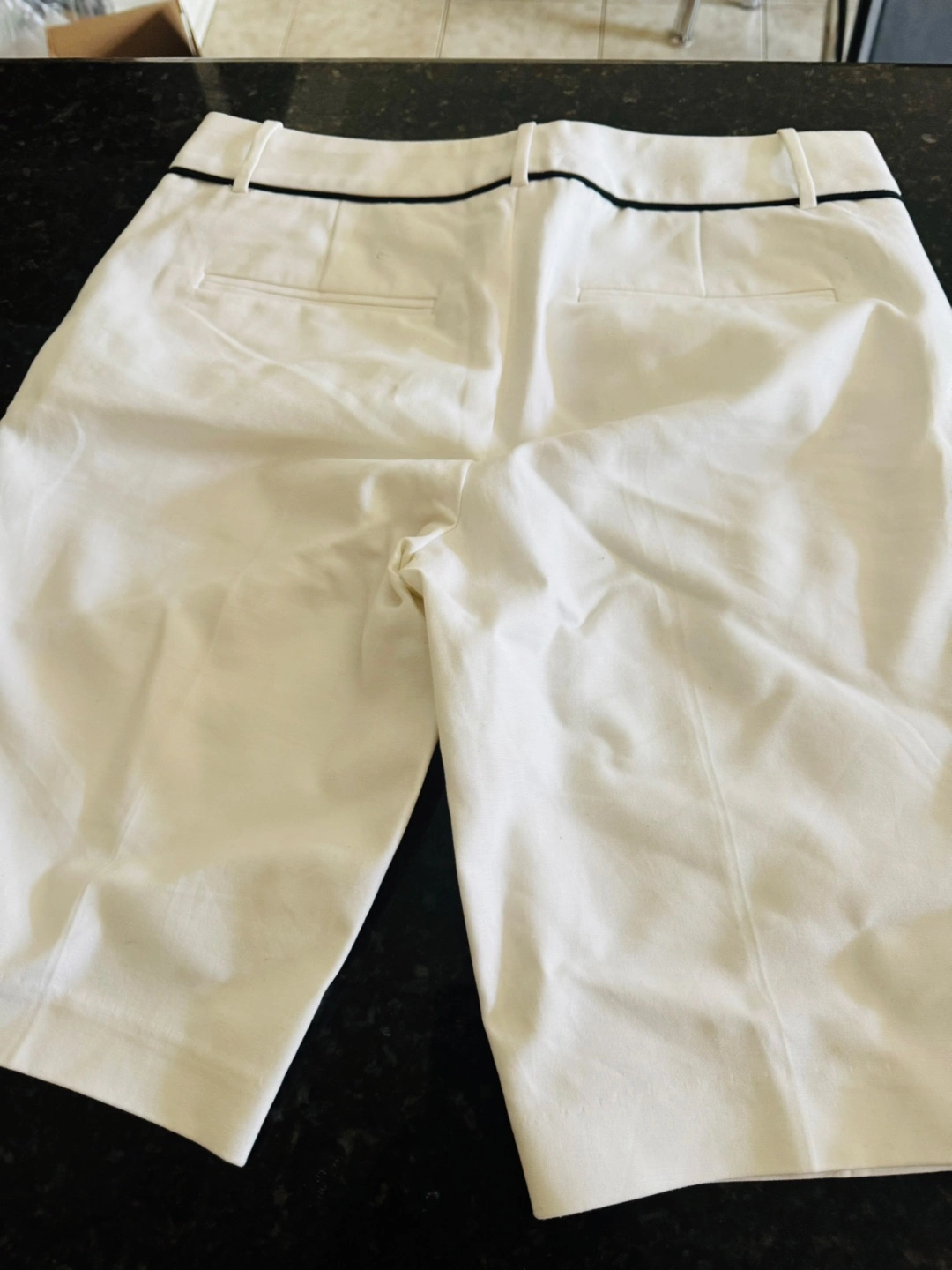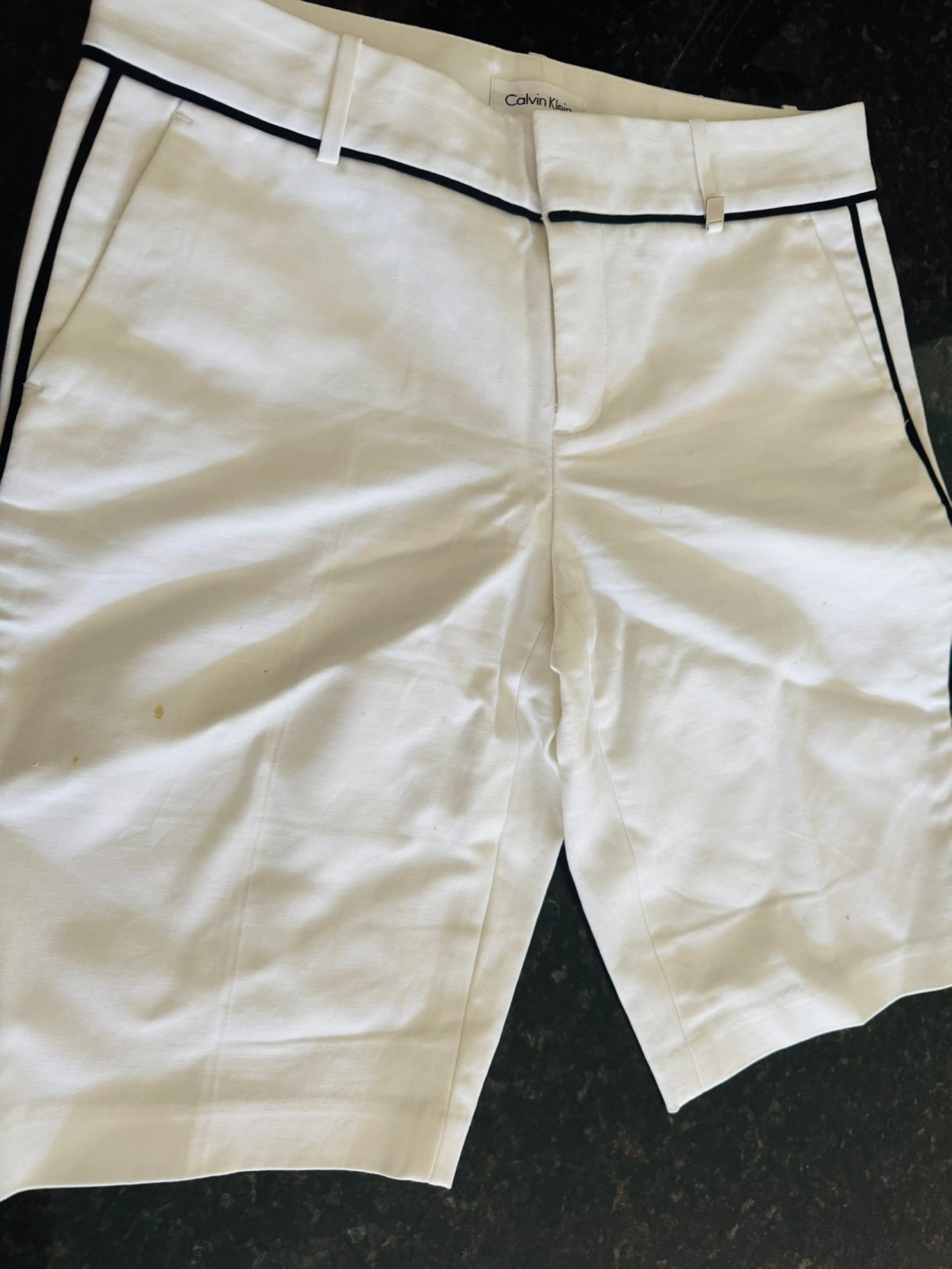 Selling a pair of Calvin Klein white shorts in size 0. They have a stylish black trim. There are some small stains on the front, as shown in the pictures, but otherwise they're in good shape!
