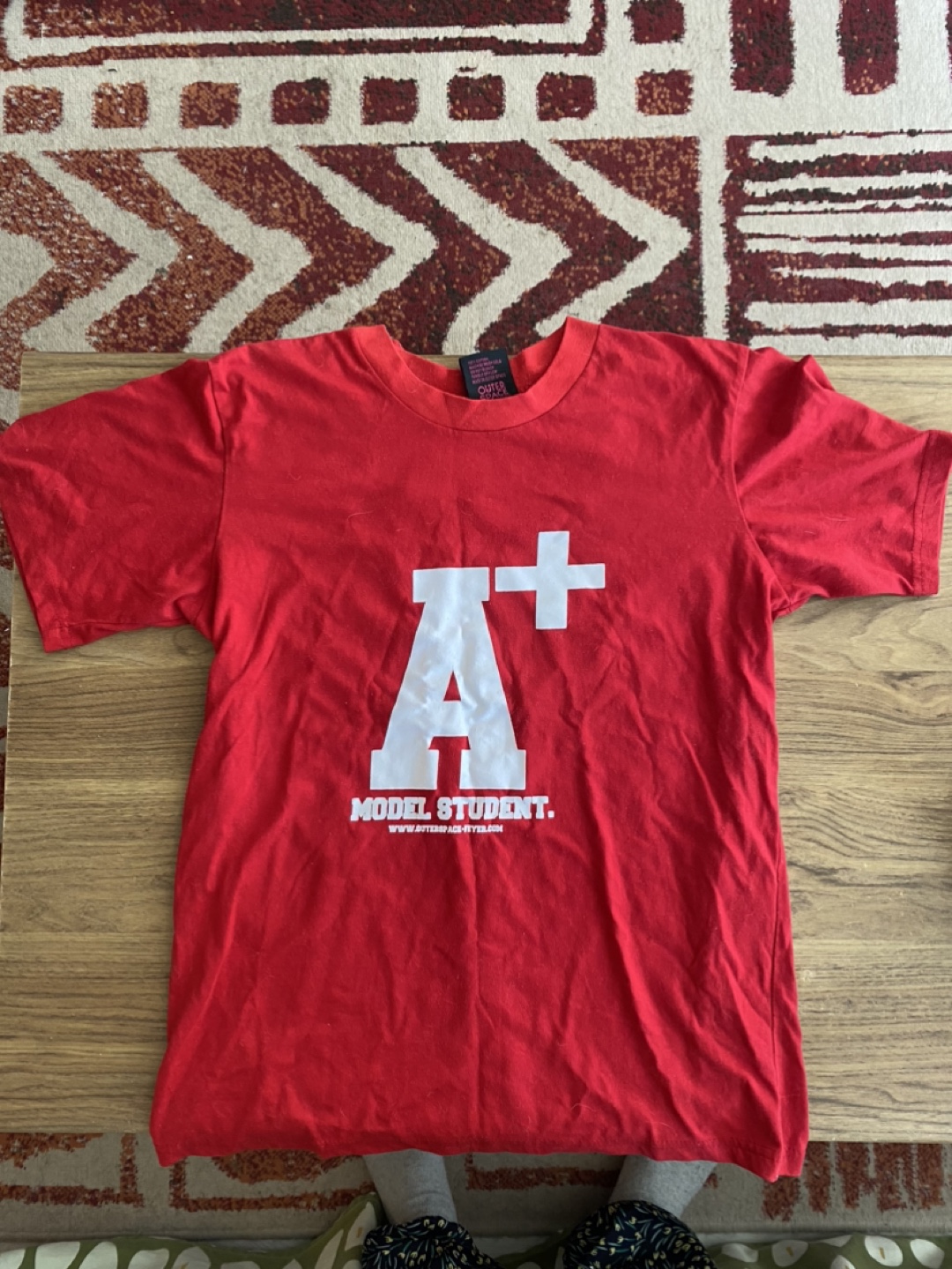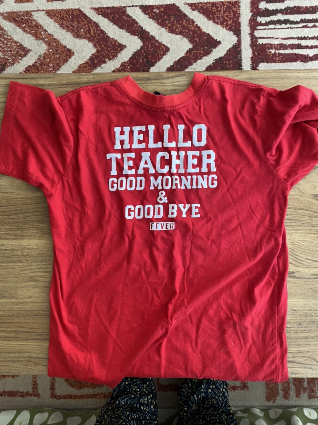 Red t-shirt with printed designs on the front and back. One side says 'HELLO TEACHER GOOD MORNING & GOOD BYE FEVER' and the other side says 'A+ MODEL STUDENT'.